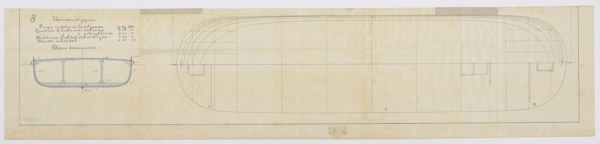 Zijaanzicht, bovenaanzicht, vooraanzicht, achteraanzicht en dwarsdoorsnede van een ijzeren dekschuit, 1890. Lengte 17.80 meter.