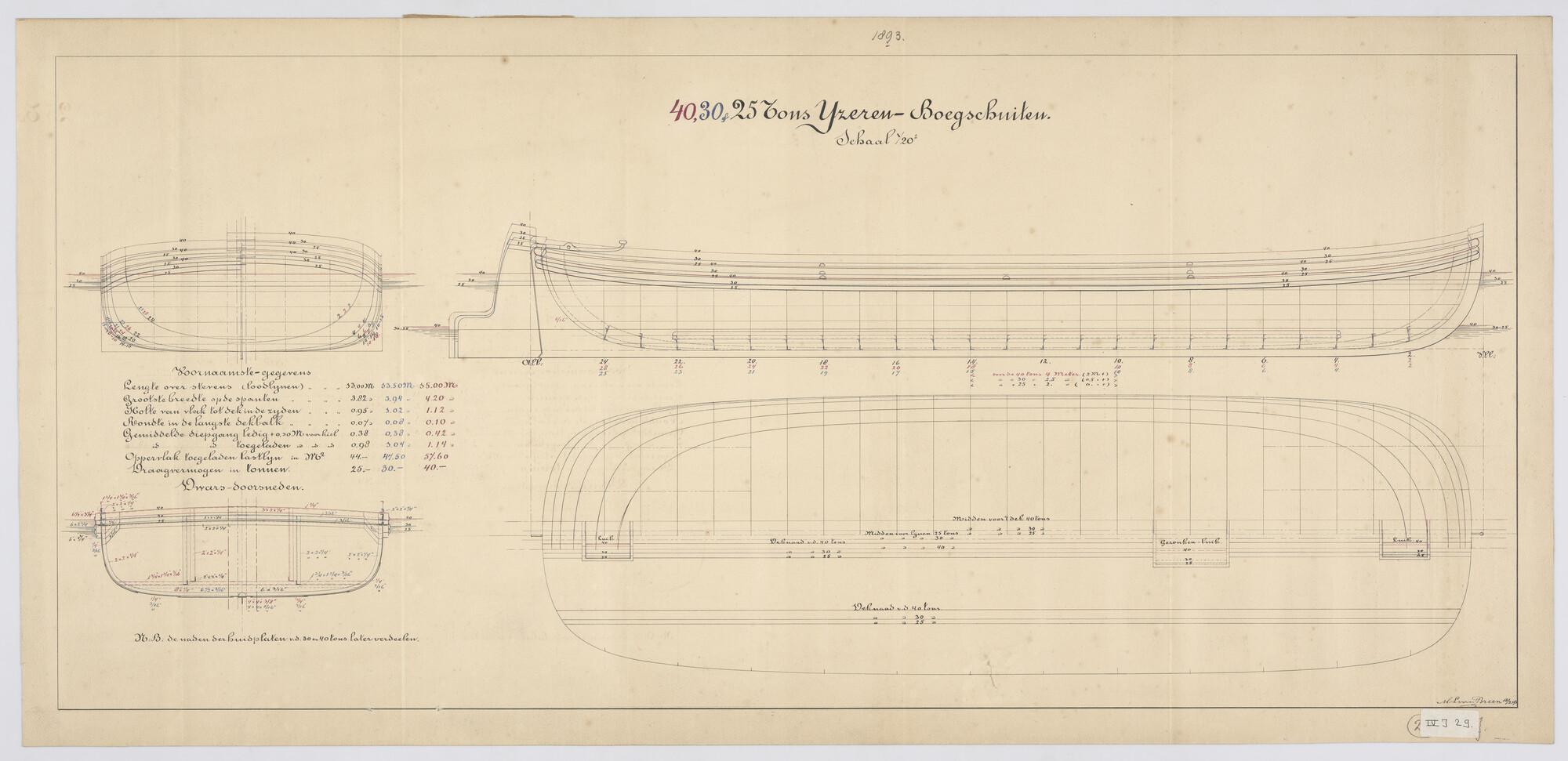 Zijaanzicht, bovenaanzicht, vooraanzicht, achteraanzicht, lijnenplan en dwarsdoorsnede, ijzeren boegschuiten 1893.