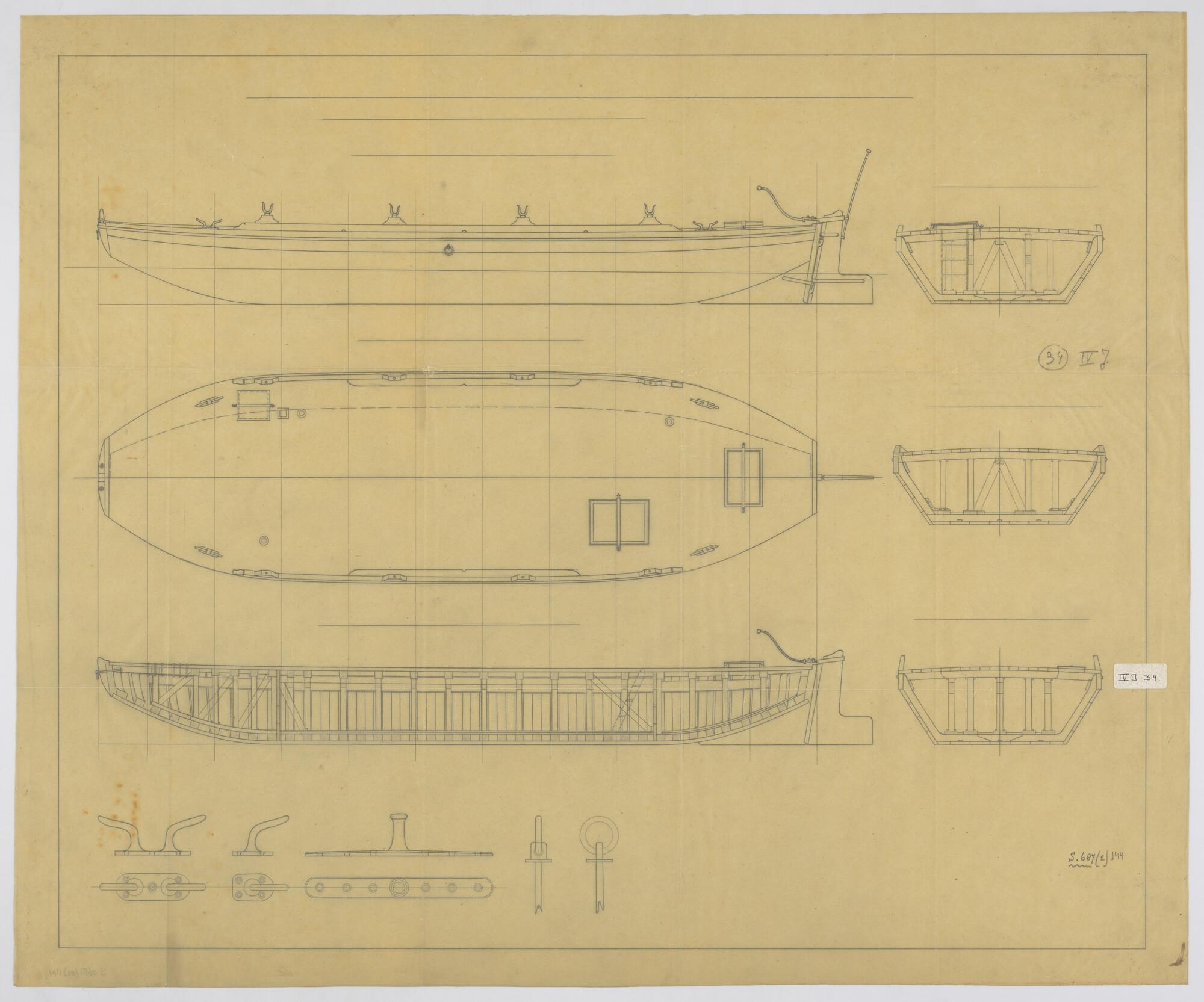 Zijaanzicht, bovenaanzicht, verticale langsdoorsnede en dwarsdoorsnede van een dekschuit als gewapende uitlegger (hout).
