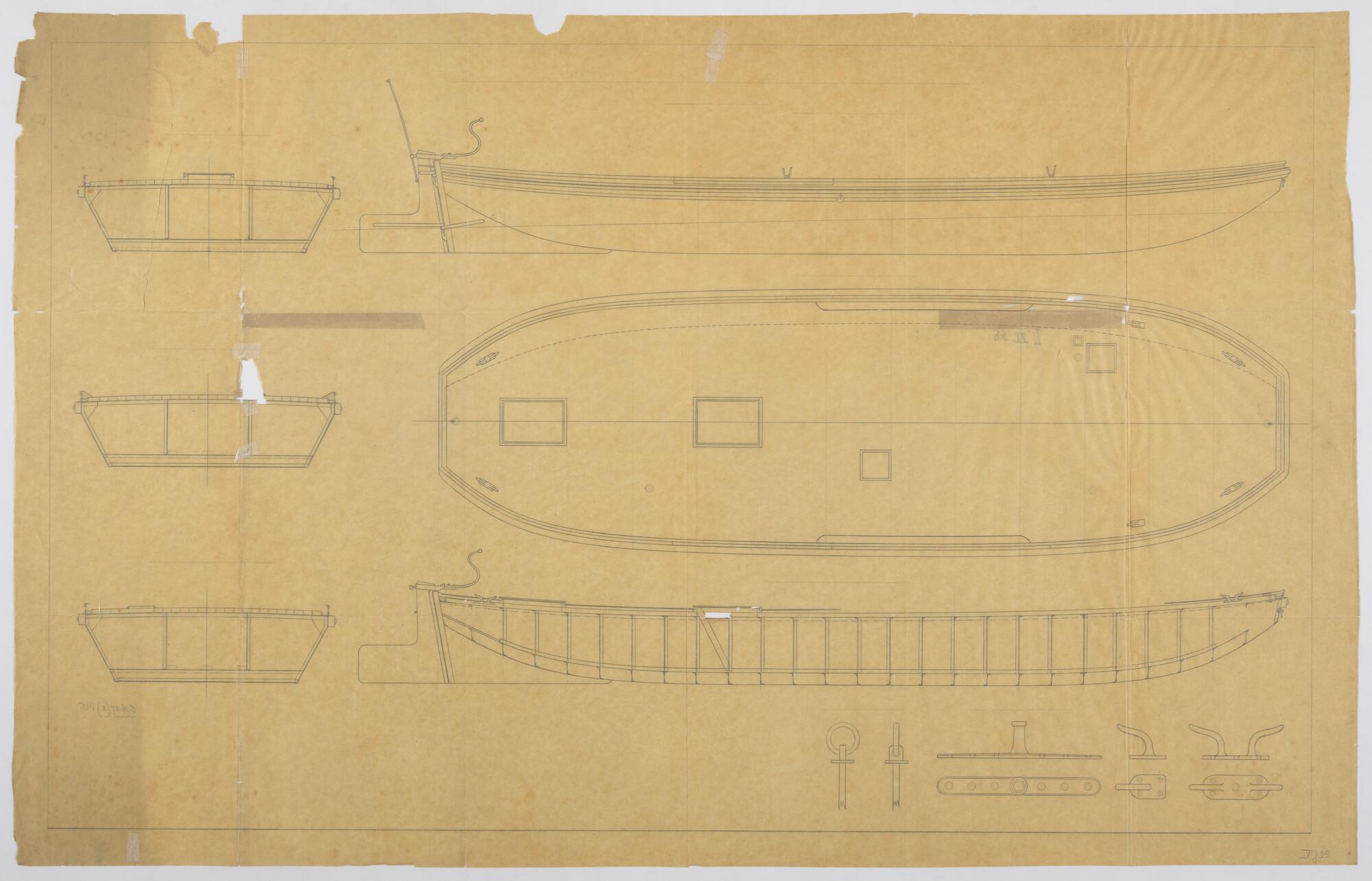 Zijaanzicht, bovenaanzicht, verticale langsdoorsnede en dwarsdoorsnede van een dekschuit als gewapende uitlegger Staal.