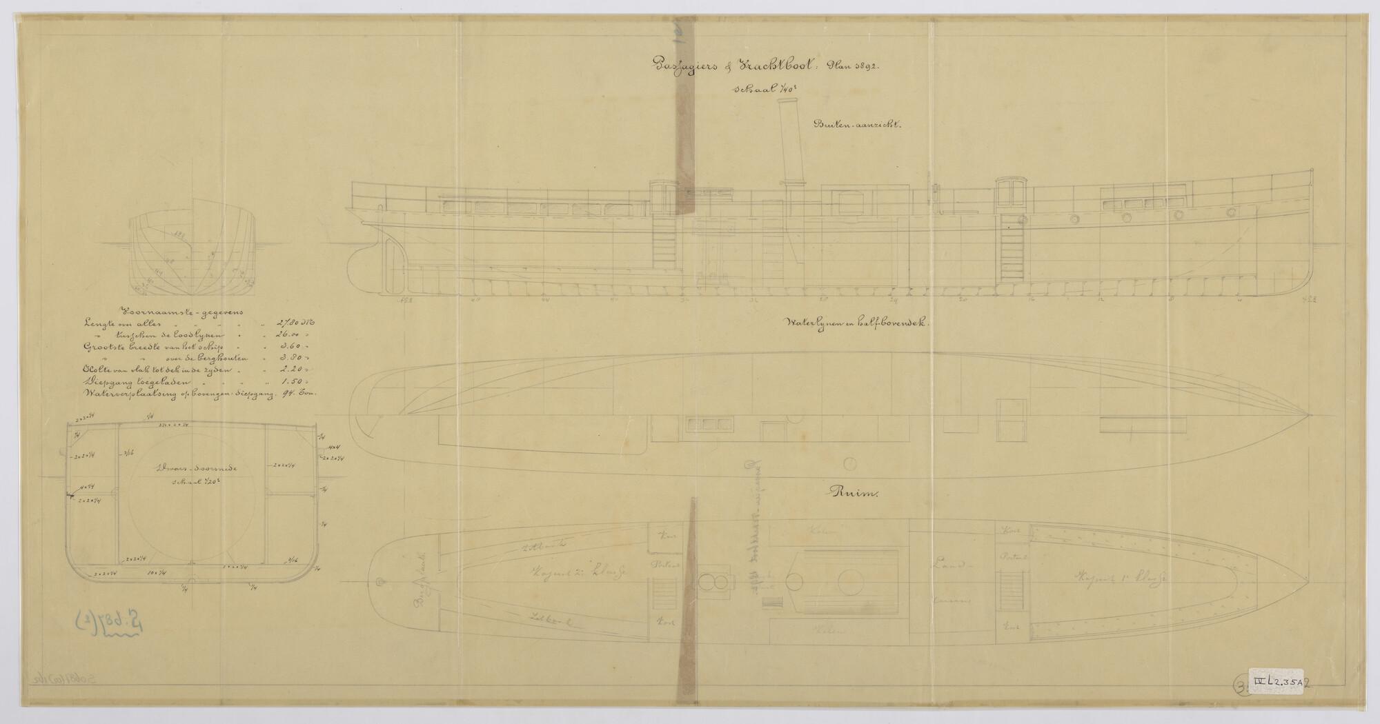 Schroefstoom vracht-passagiersschip 1892. Verticale langsdoorsnede, spantenraam, waterlijnen, grootspant, bovendek en horizontale langsdoorsnede van een schroefstoom vracht-passagiersschip 1892. Afmetingen 26 x 3.60 x 2.20 meter.