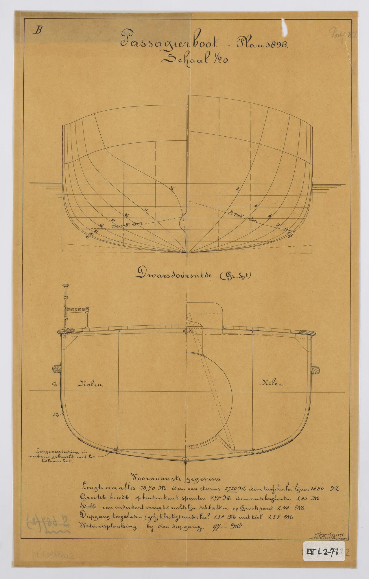 Stoompassagiersboot 1898. Zijaanzicht, bovenaanzicht, spantenraam, grootspant, verticalen en waterlijnen van een stoompassagiersboot 1898. Afmetingen 28.70 x 4.72 x 2.40 m.