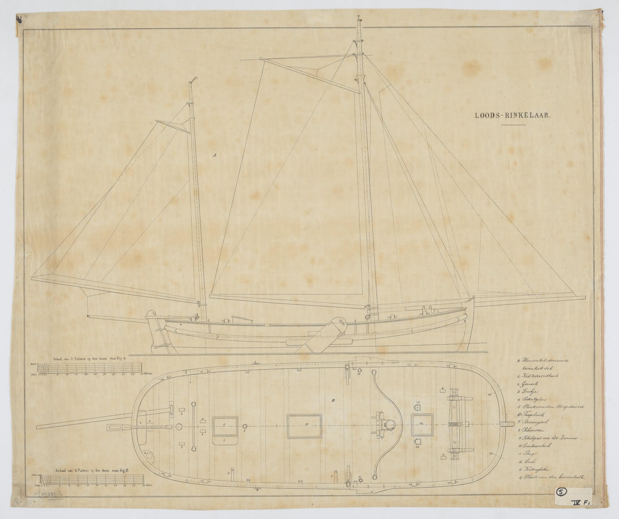 Loodsrinkelaar. Zijaanzicht, tuigplan, dekplan, Loodsrinkelaar, 1853.