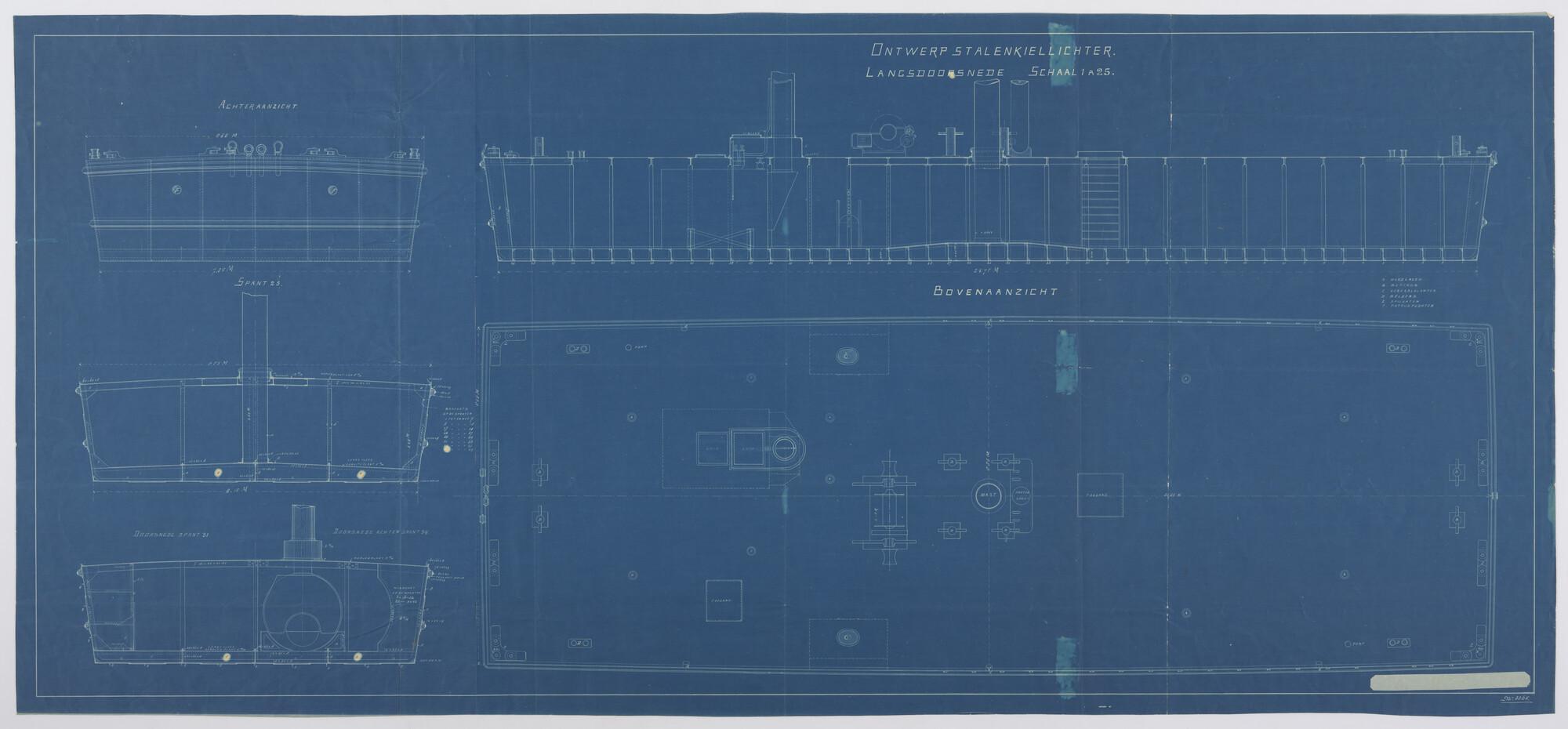 Verticale langsdoorsnede, bovenaanzicht, Met stoomketel en lier van een kiellichter (staal).
