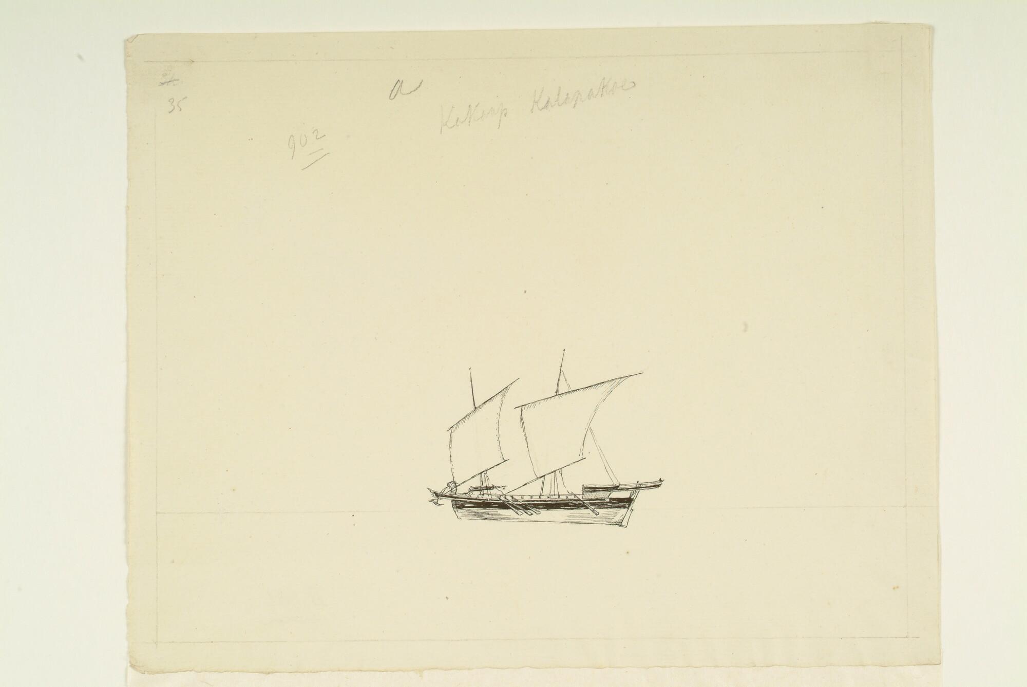 Tekening van een inlands vaartuig uit de Oostindische Archipel: een Kakaap Kalapakoe