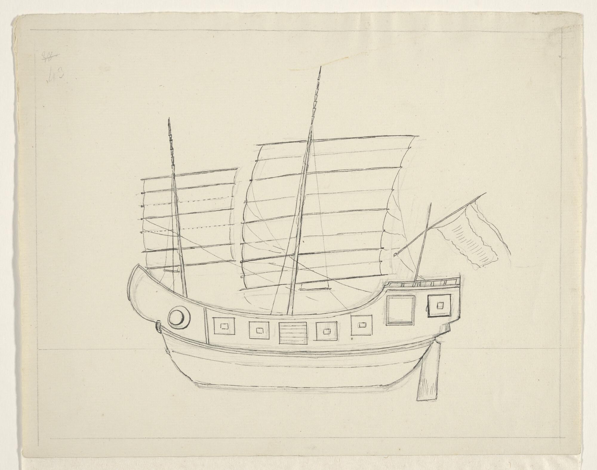 Tekening van een inlands vaartuig uit de Oostindische Archipel