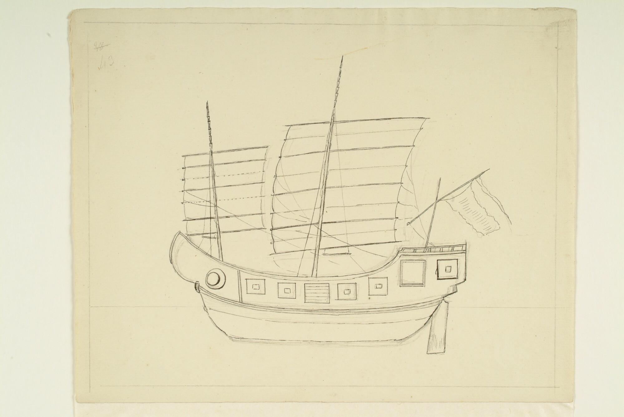 Tekening van een inlands vaartuig uit de Oostindische Archipel.