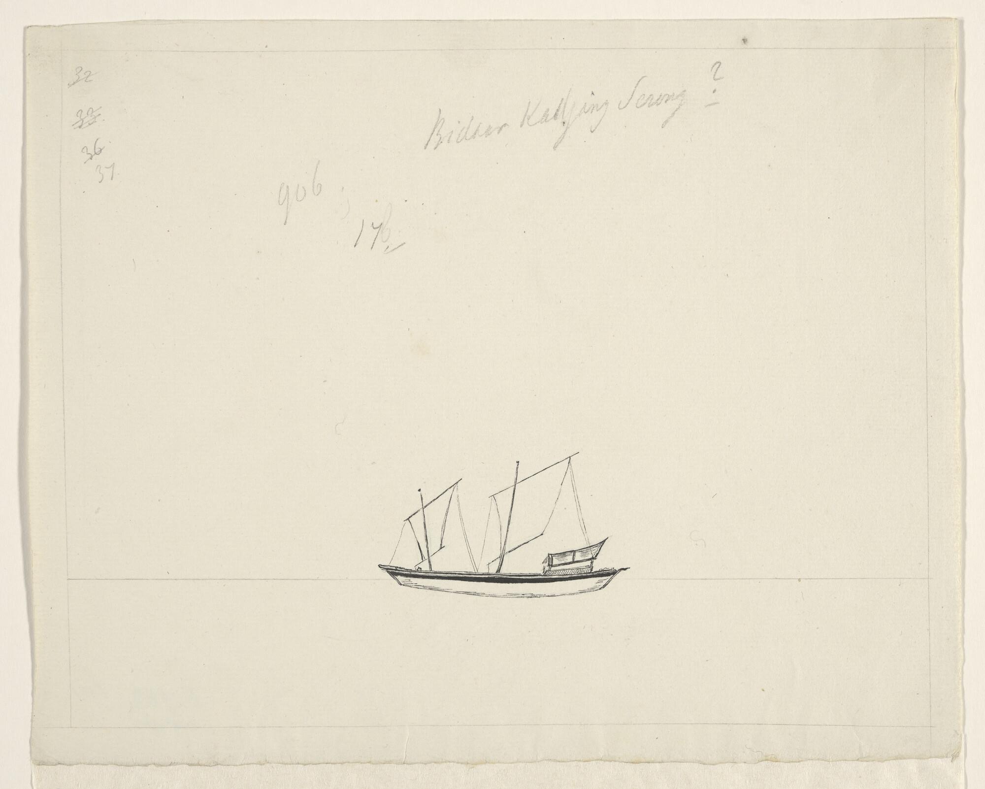 Tekening van een inlands vaartuig uit de Oostindische Archipel: een Bidaar Katjang Serong [?].