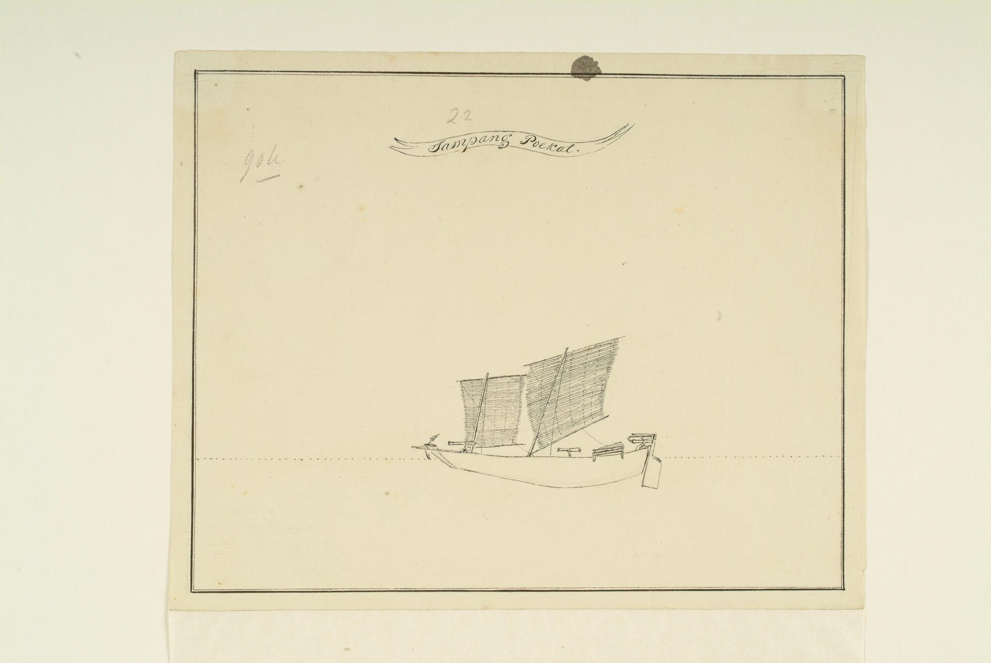 Tekening van een inlands vaartuig uit de Oostindische Archipel: een Sampang Poekat