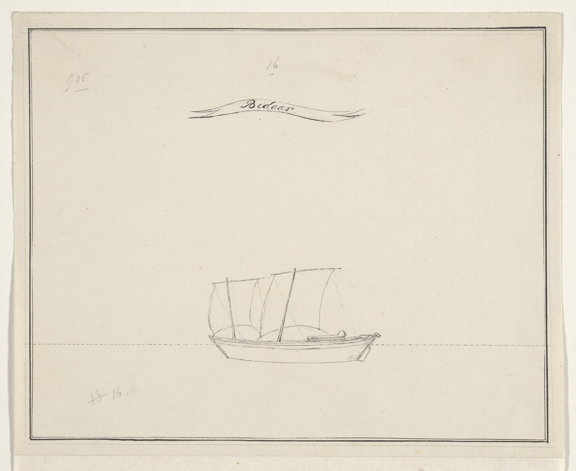 Tekening van een inlands vaartuig uit de Oostindische Archipel: een Bidaar.