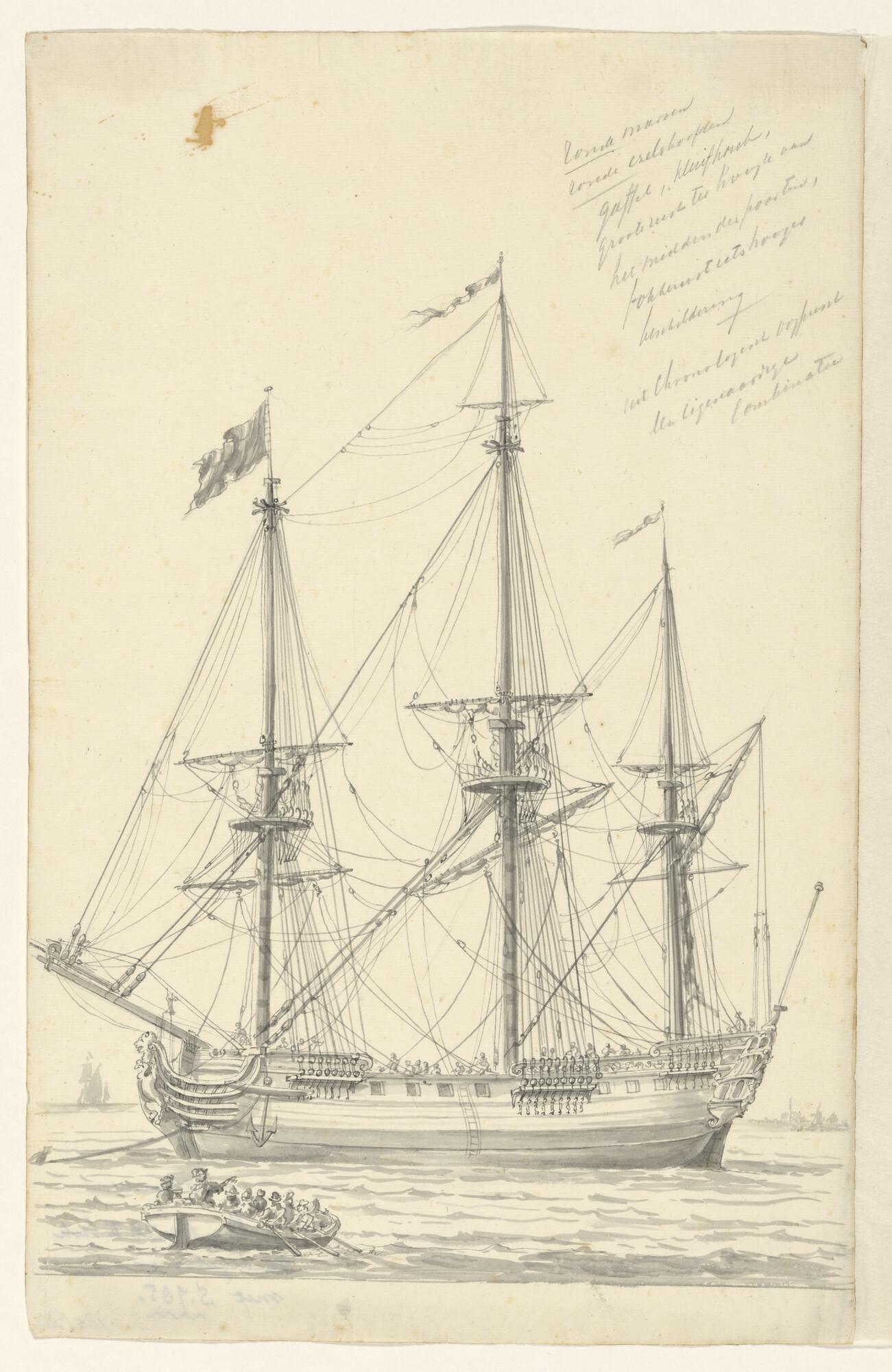 Een driemastschip ten anker, gezien van bakboordzijde.
