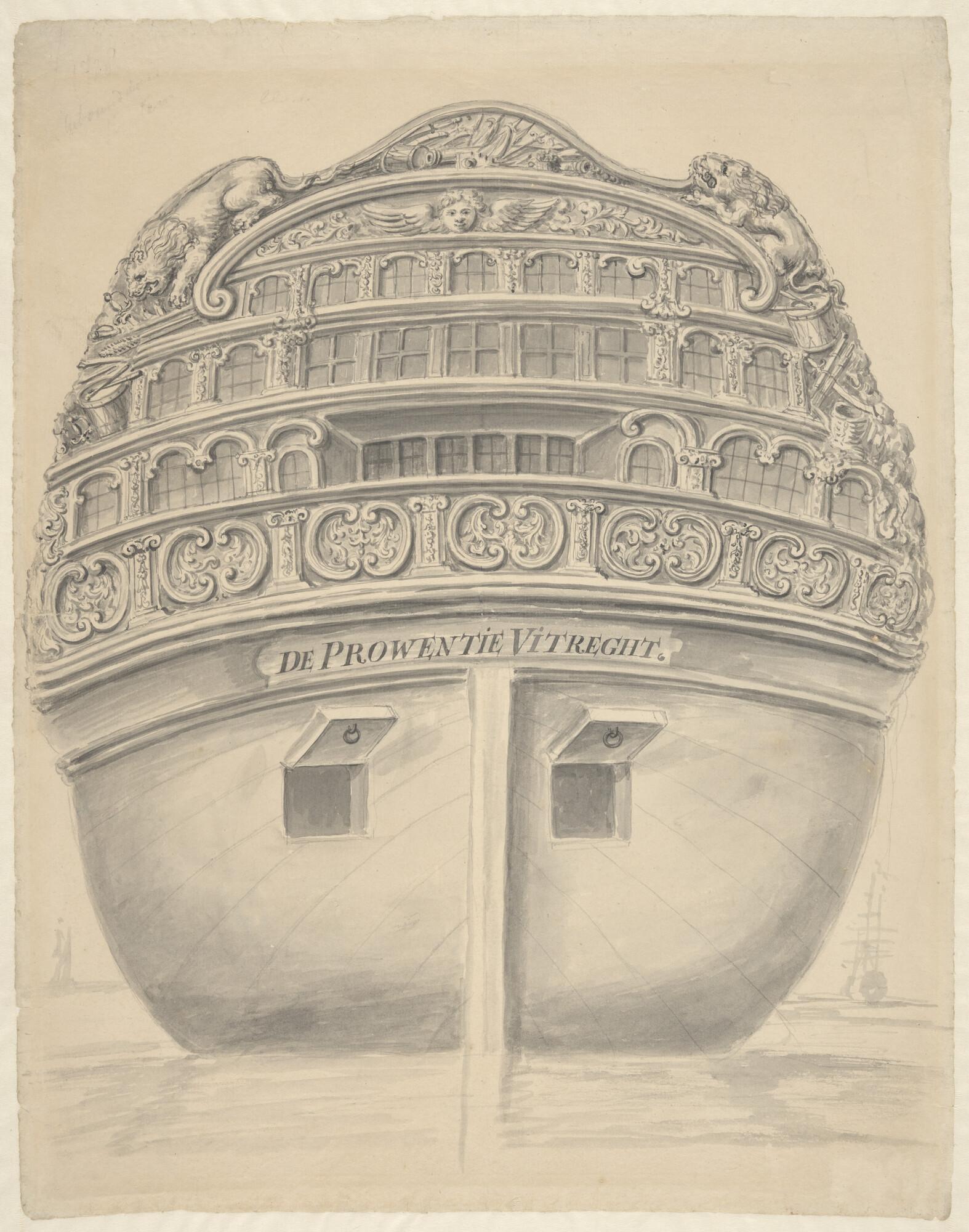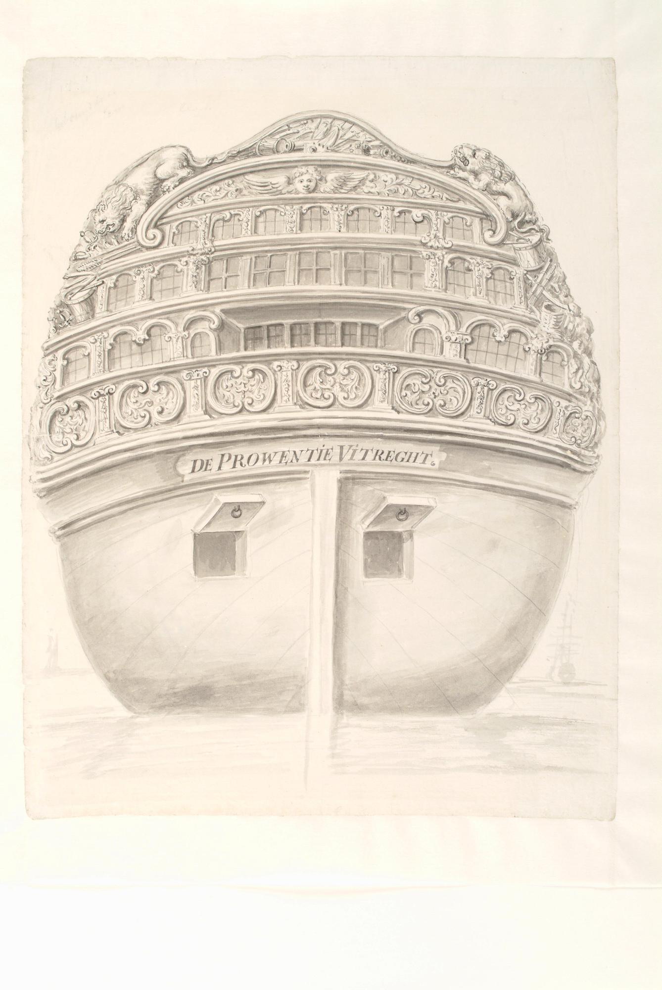 Spiegel van het oorlogsschip "De Prowentie Uitreght" (De Provincie Utrecht) van 64 stukken, het eerste in ons land gebouwde schip met een ronde achtersteven.