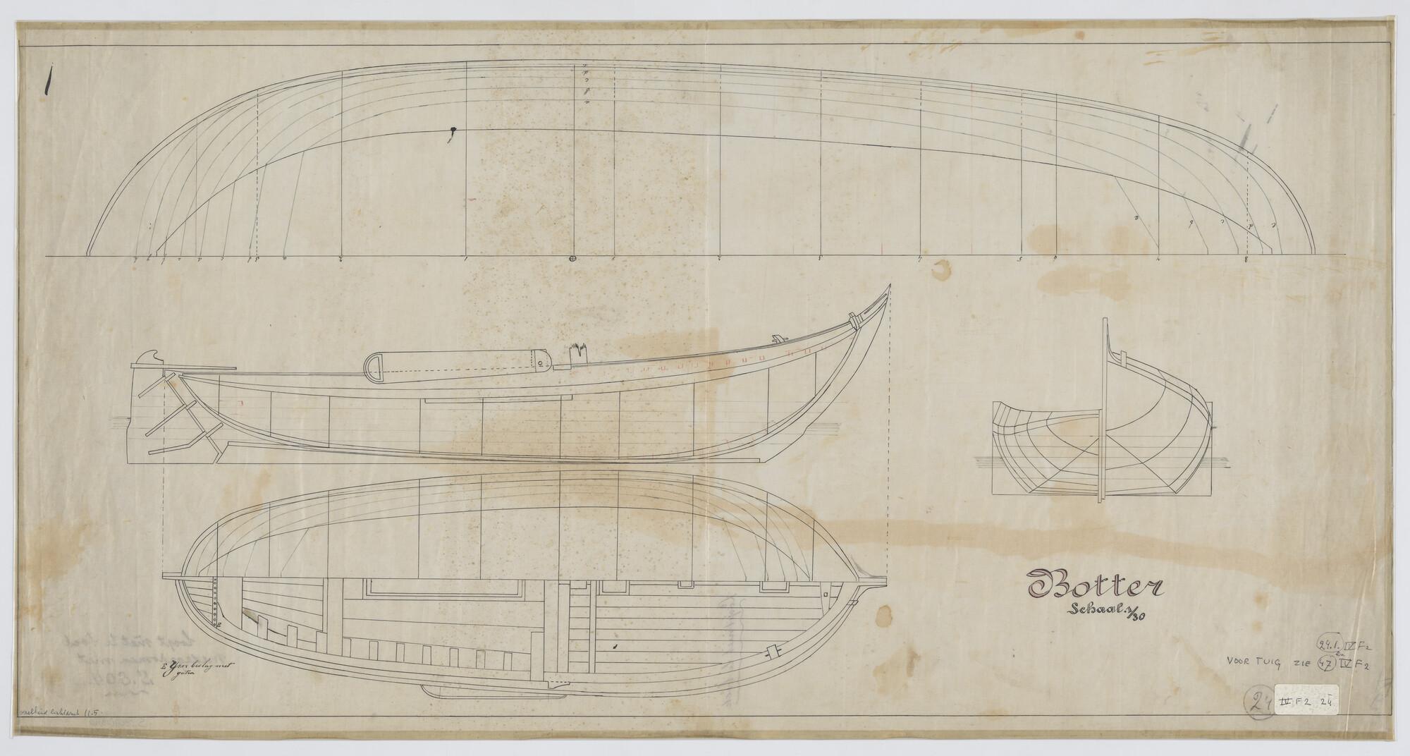 Zijaanzicht, bovenaanzicht, vooraanzicht, achteraanzicht, waterlijnen van een botter.