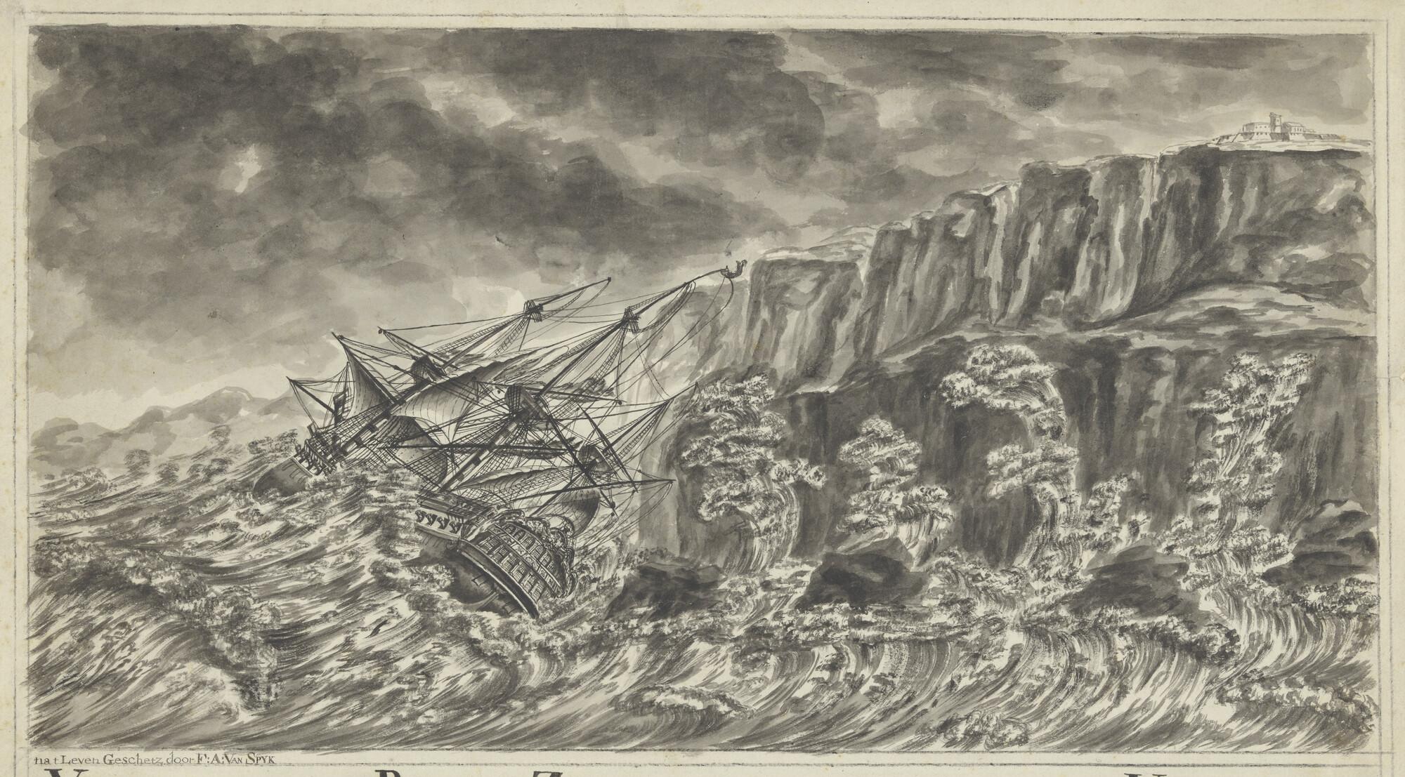 Het oorlogsschip "Vrijheid" aan lager wal bij het eiland Minorca.