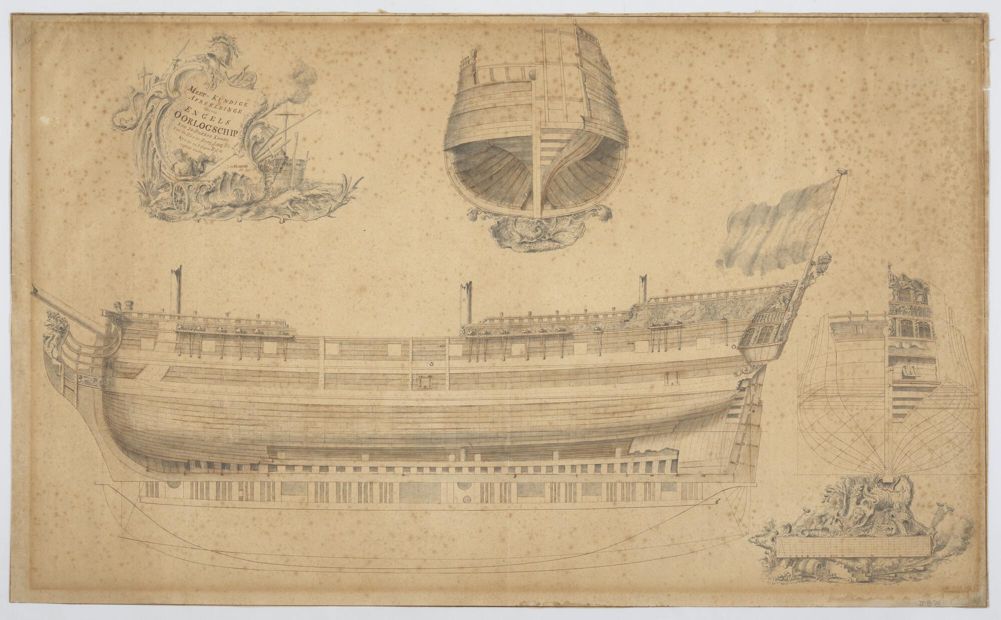 Zijaanzicht, bovenaanzicht, voor- en achteraanzicht en spatenraam van een Engels oorlogsschip van de zesde rang van 20 stukken, 1767.