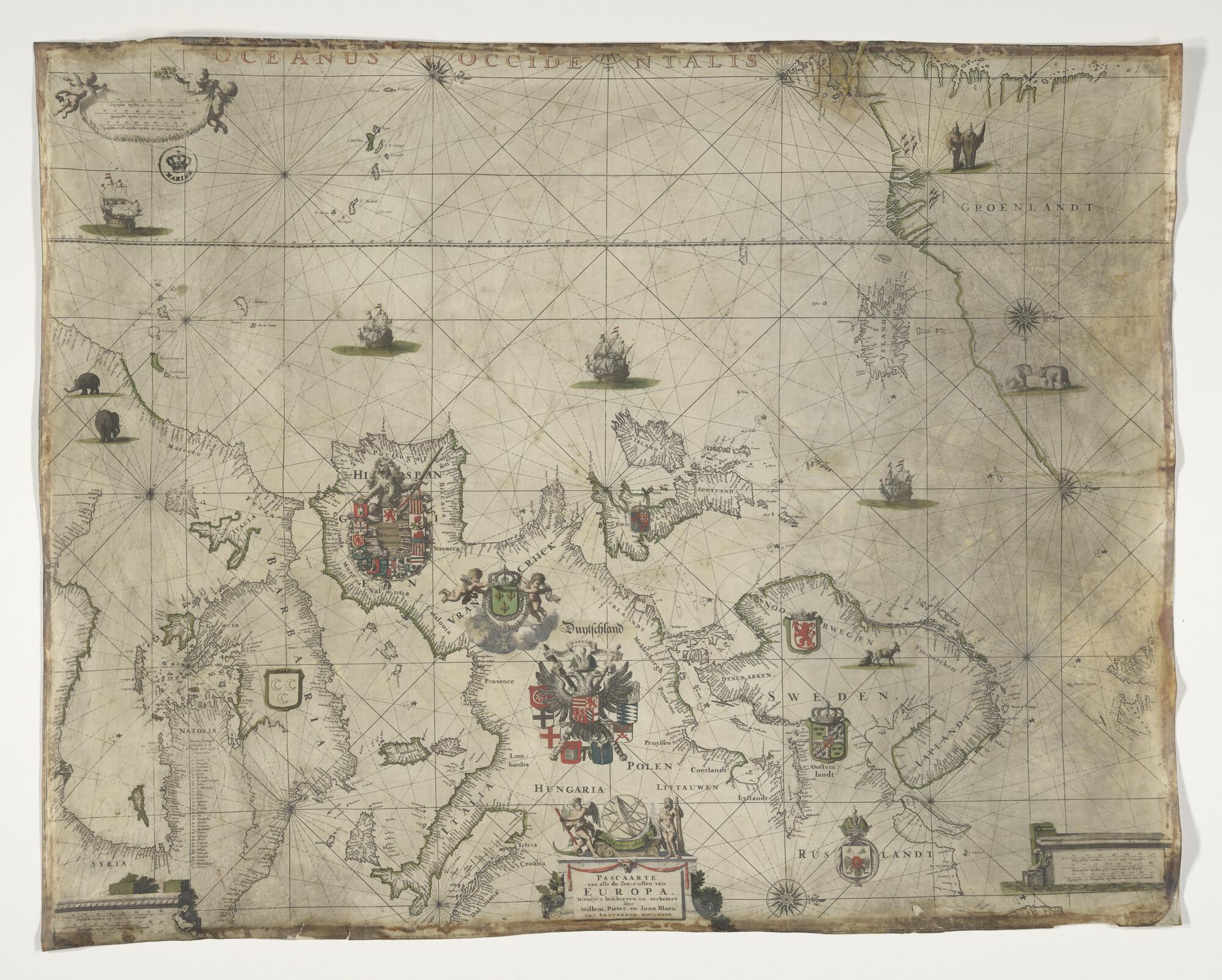 Met de hand gekleurde, gedrukte Europese paskaart door Willem, Pieter & Joan Blaeu