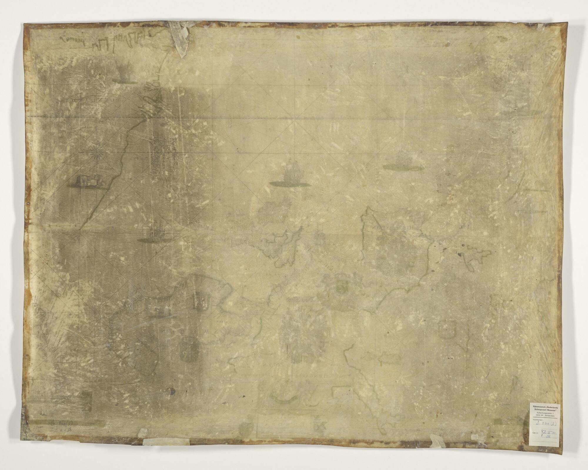 Met de hand gekleurde, gedrukte Europese paskaart door Willem, Pieter & Joan Blaeu, 1677 te Amsterdam. De kaart bevat de route van een schip. Er zijn passerpunten te zien van middagbestekken vanaf Zeeland benoorden Schotland naar de Canarische eilanden. schaal 1 op 8.000.000