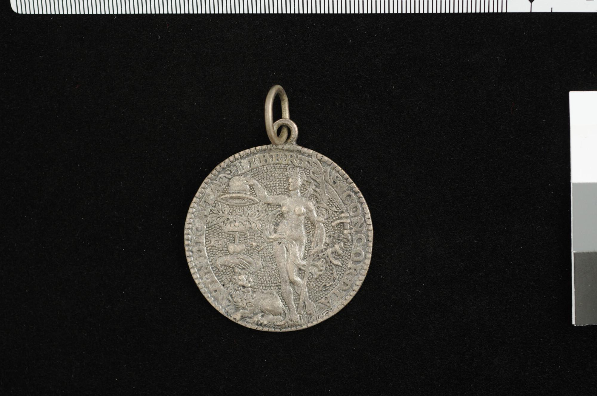 Draagpenning op het Eeuwig Edict, gesloten tussen de Spaanse landvoogd van de Nederlanden Don Juan van Oostenrijk en de Staten-Generaal, 1577