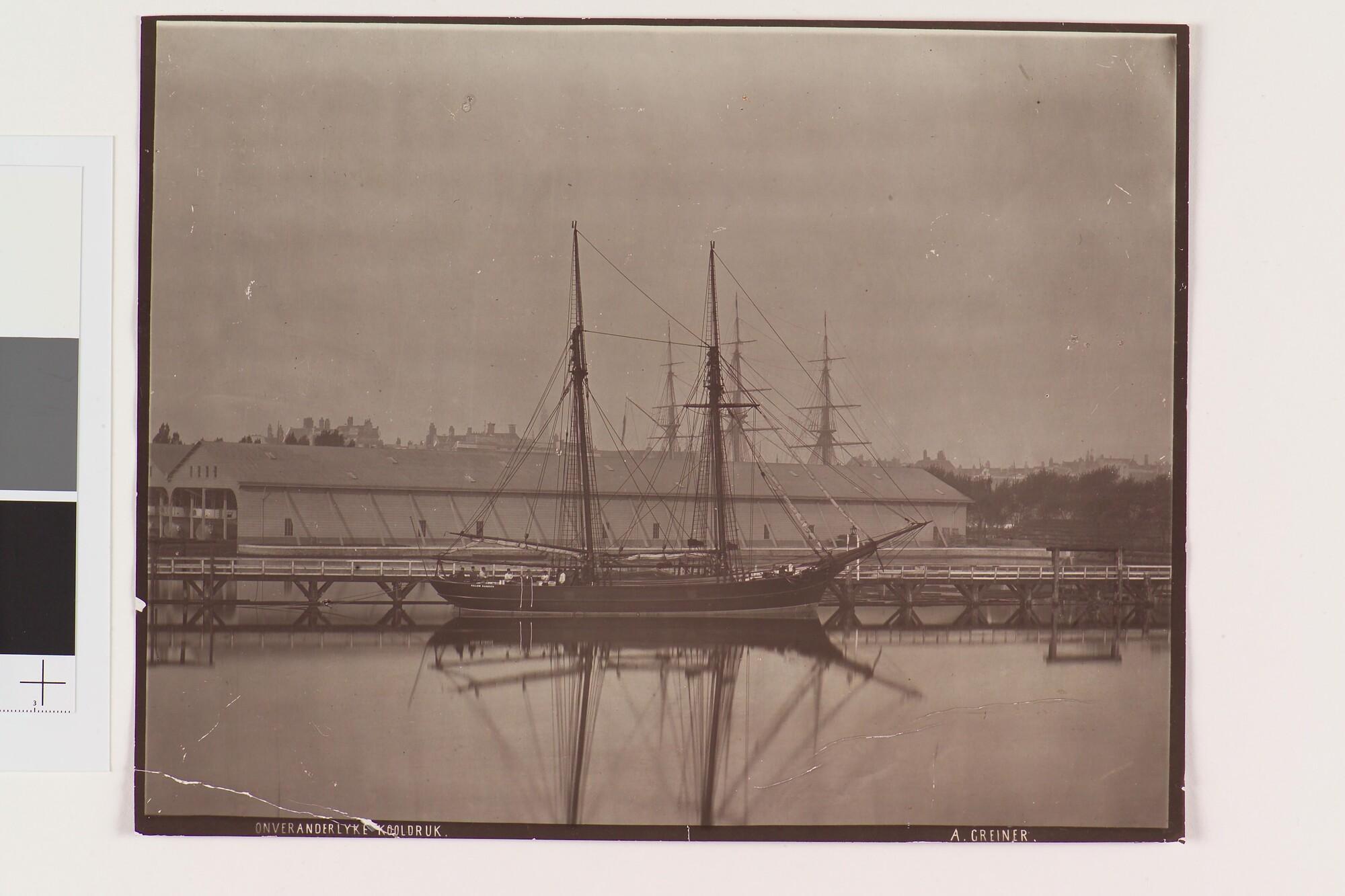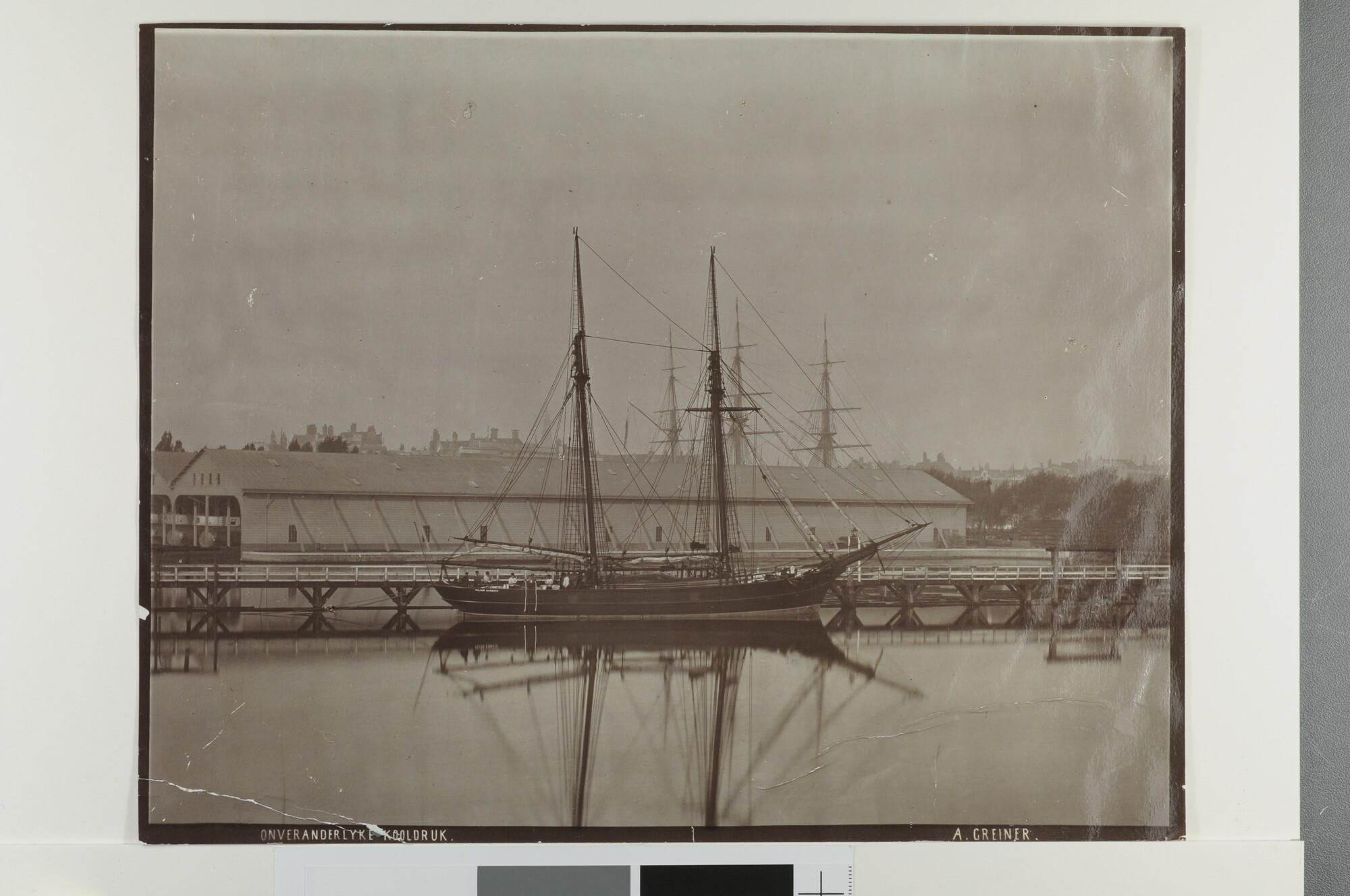 De schoener Willem Barents liggend op de Marinewerf te Amsterdam, nog zonder dekhuis, in 1878 [reproductiefoto].