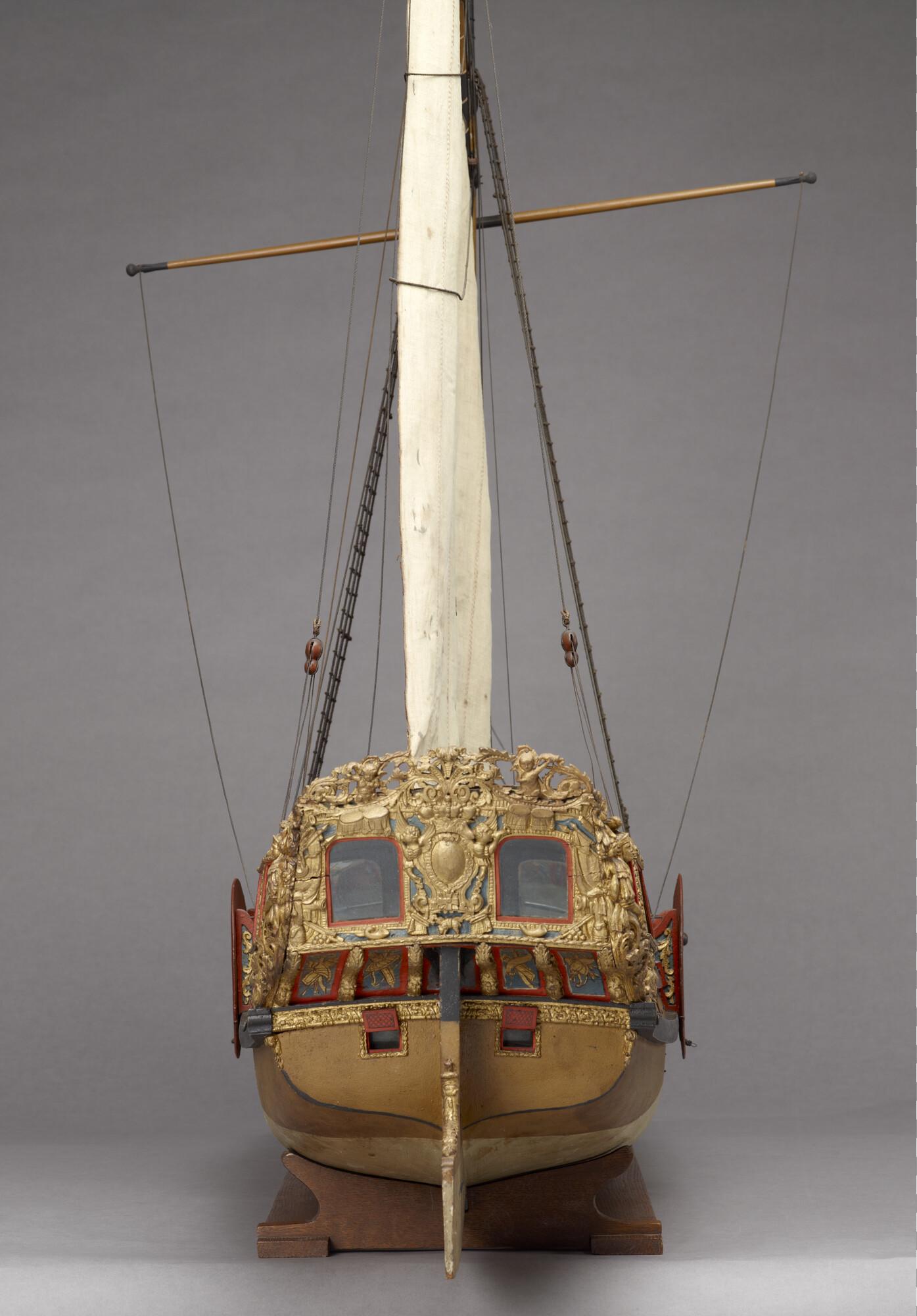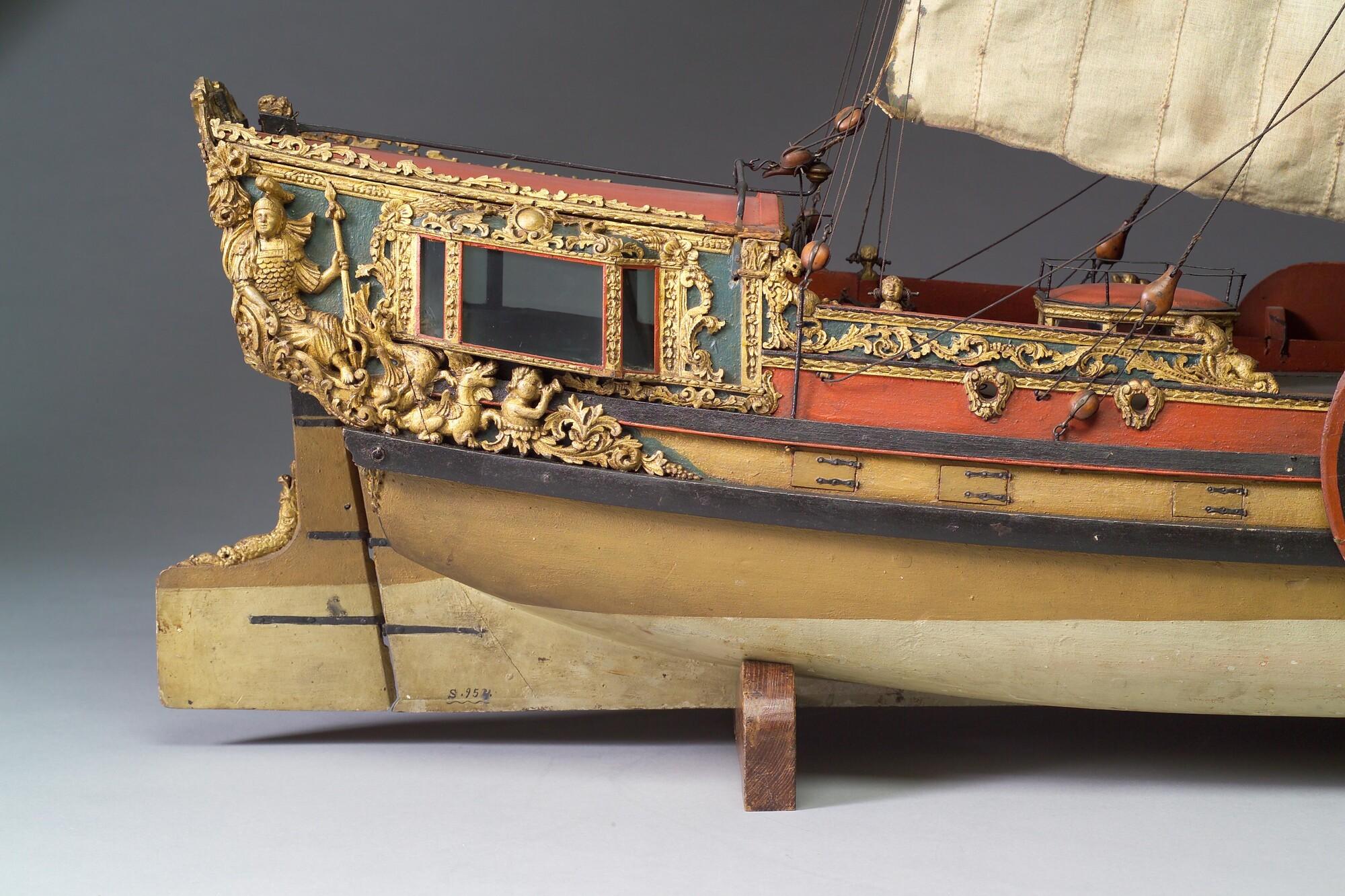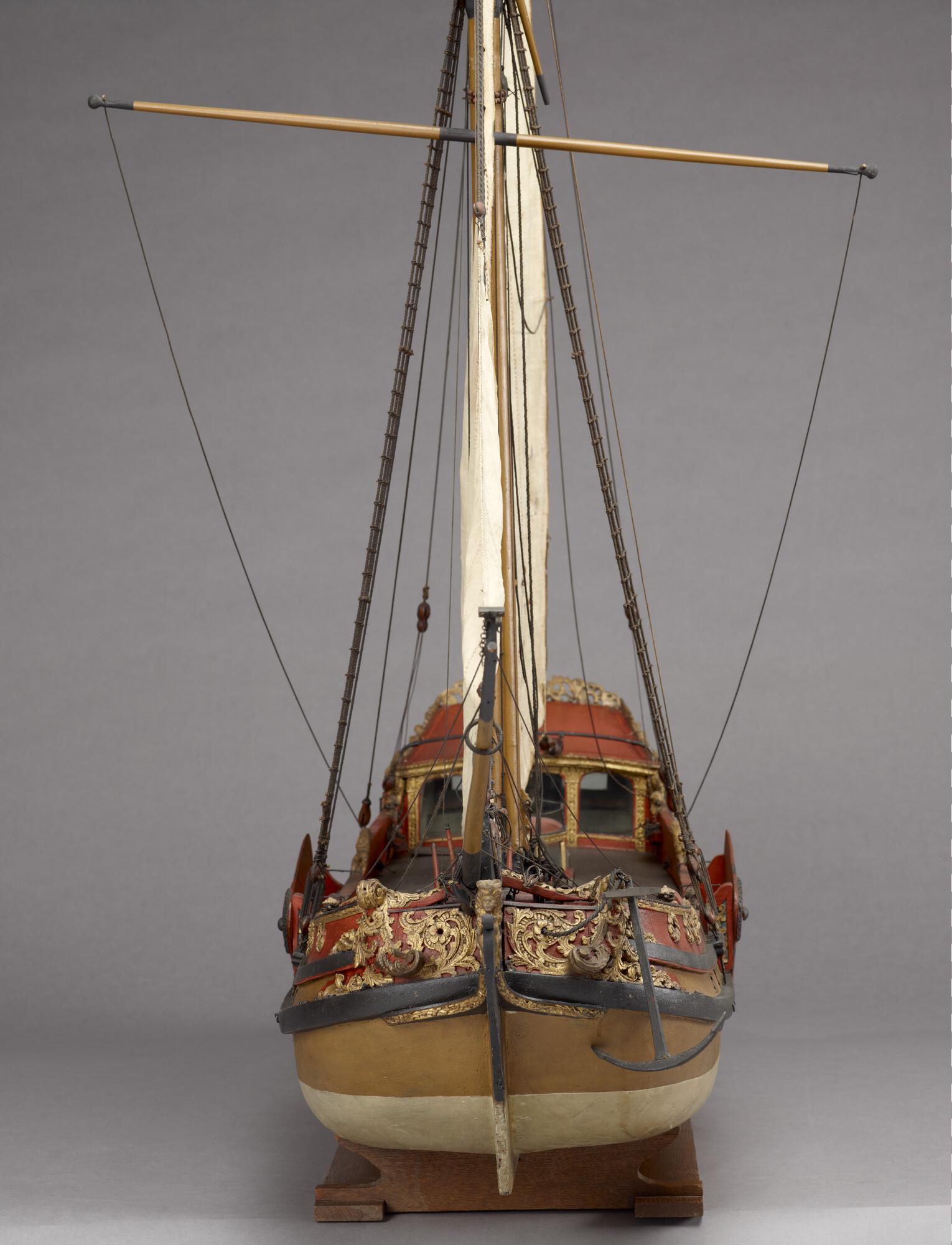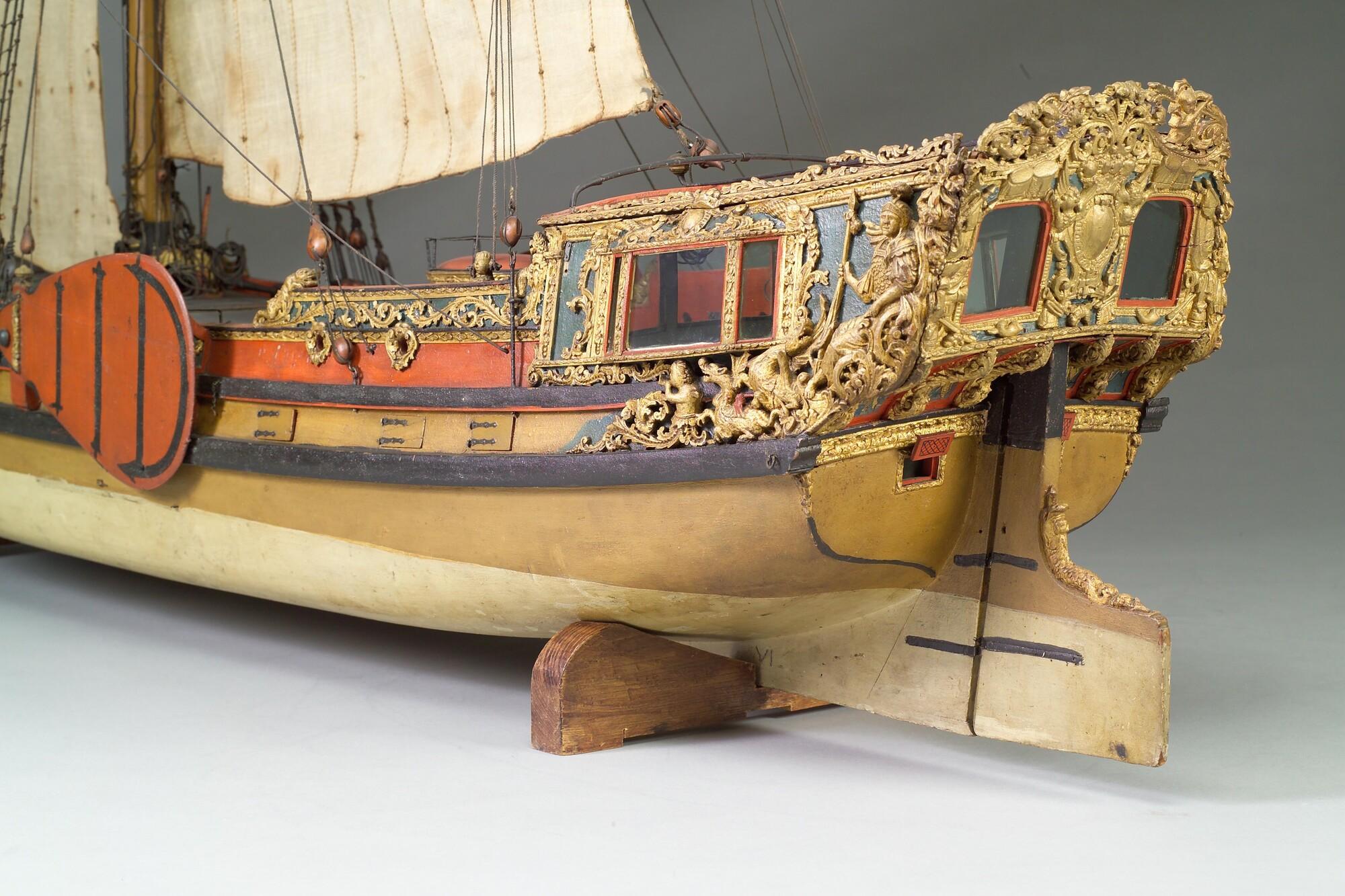 Getuigd model van het jacht voor Johann Wilhelm van de Palts. Op de spiegel het wapen van Johann Wilhelm met keurvorstelijke hoed en ook de tekenen van de St. Hubertusorde en de orde van het Gulden Vlies.
