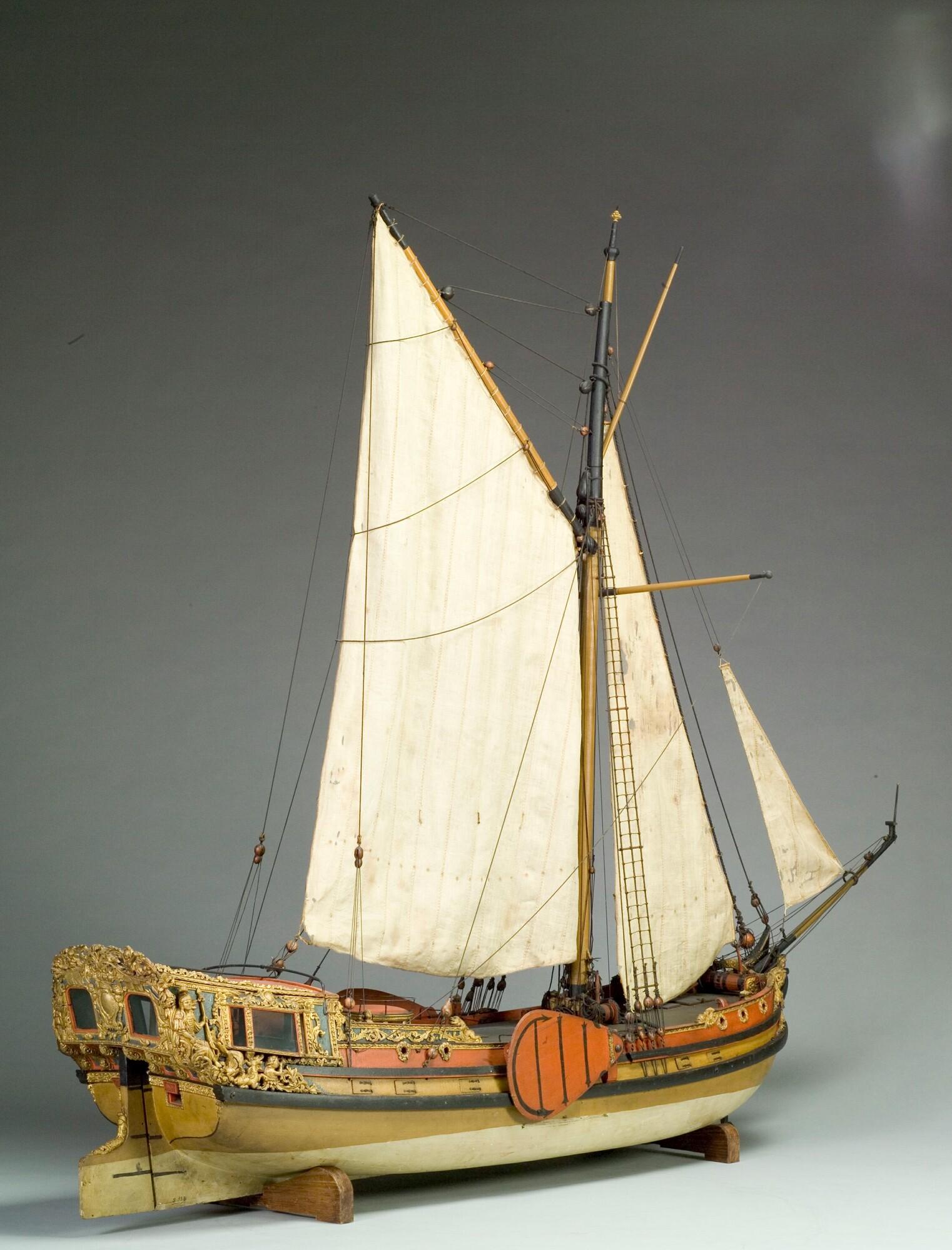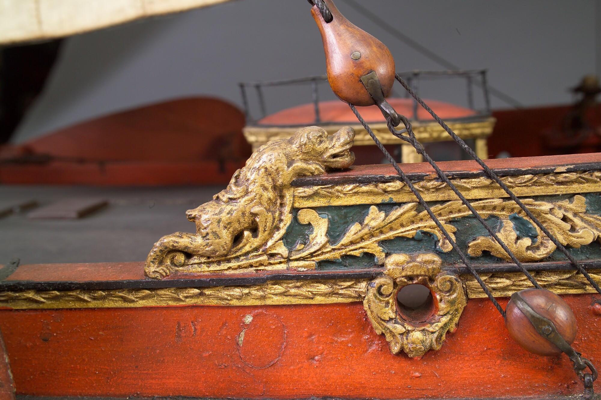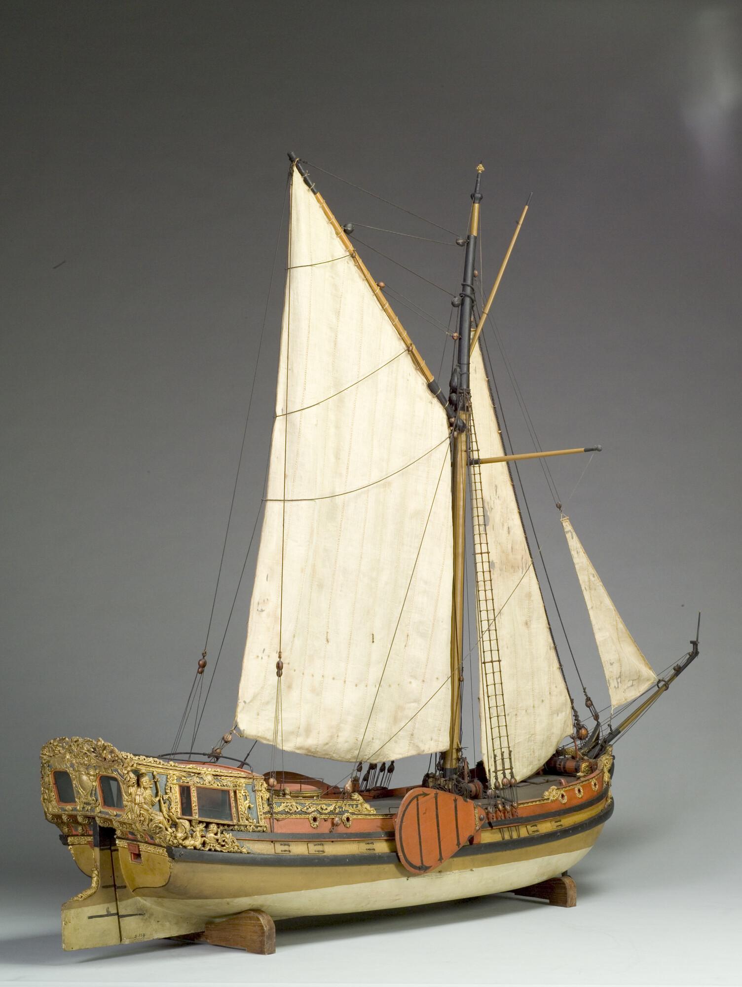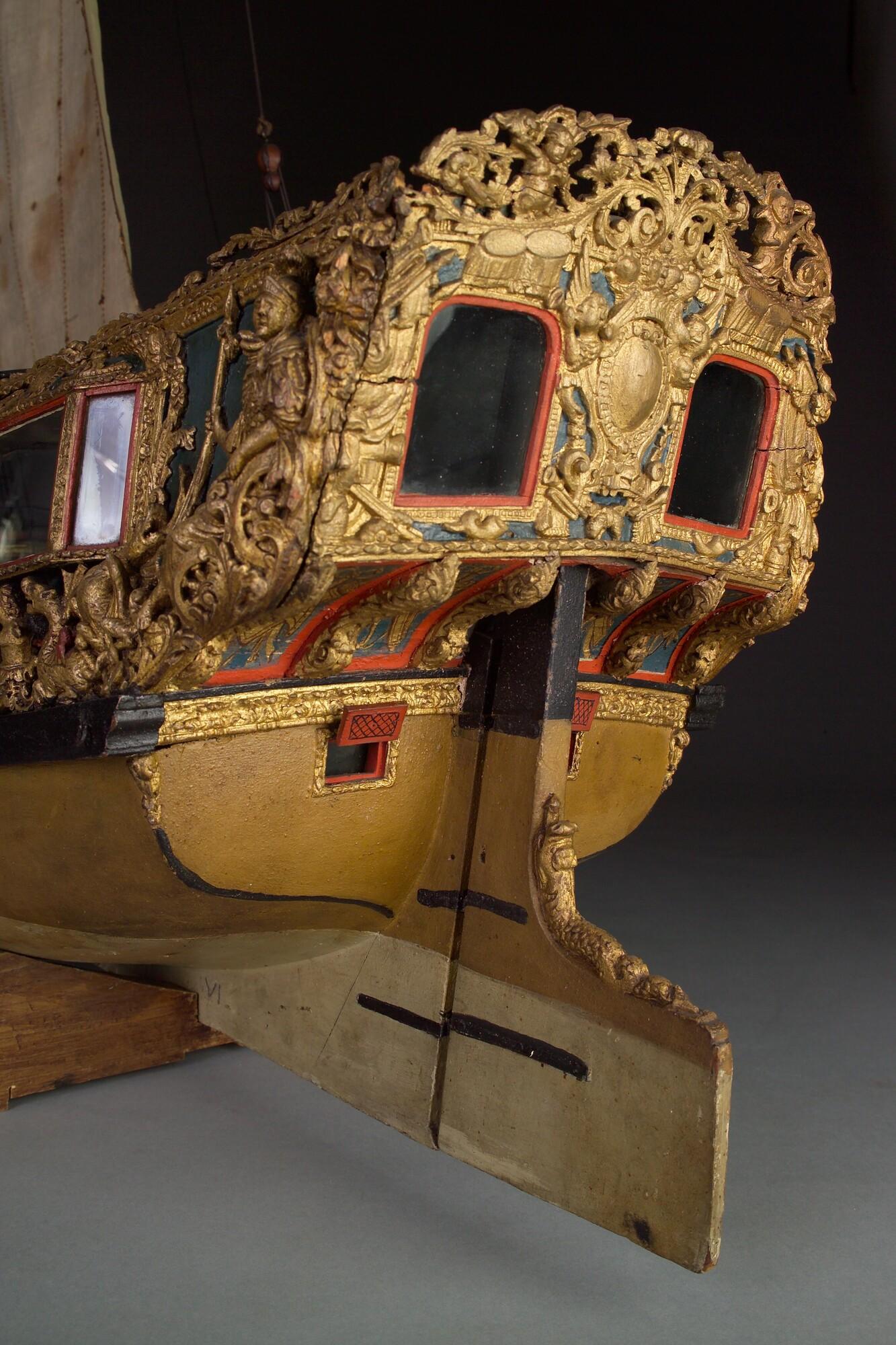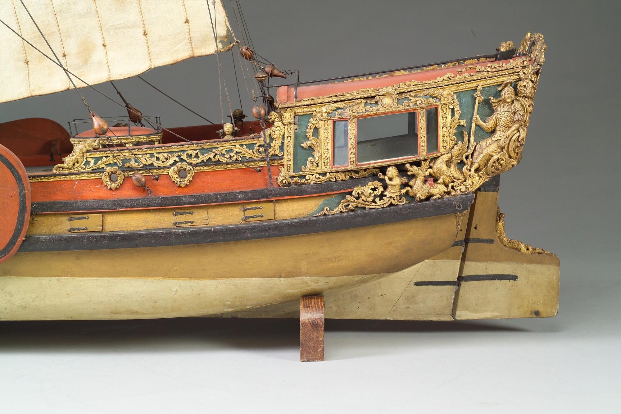 Getuigd model van het jacht voor Johann Wilhelm van de Palts. Op de spiegel het wapen van Johann Wilhelm met keurvorstelijke hoed en ook de tekenen van de St. Hubertusorde en de orde van het Gulden Vlies.