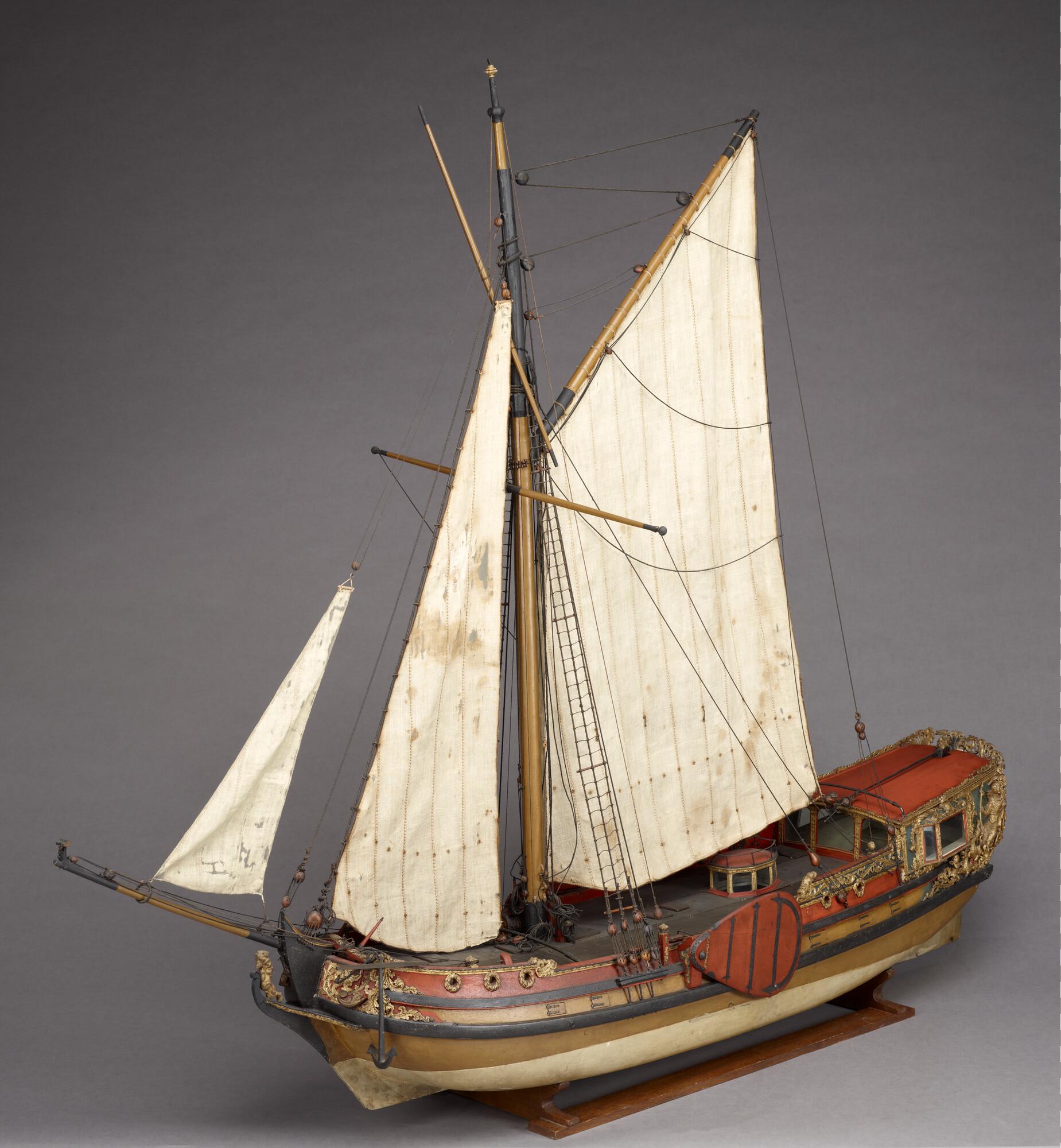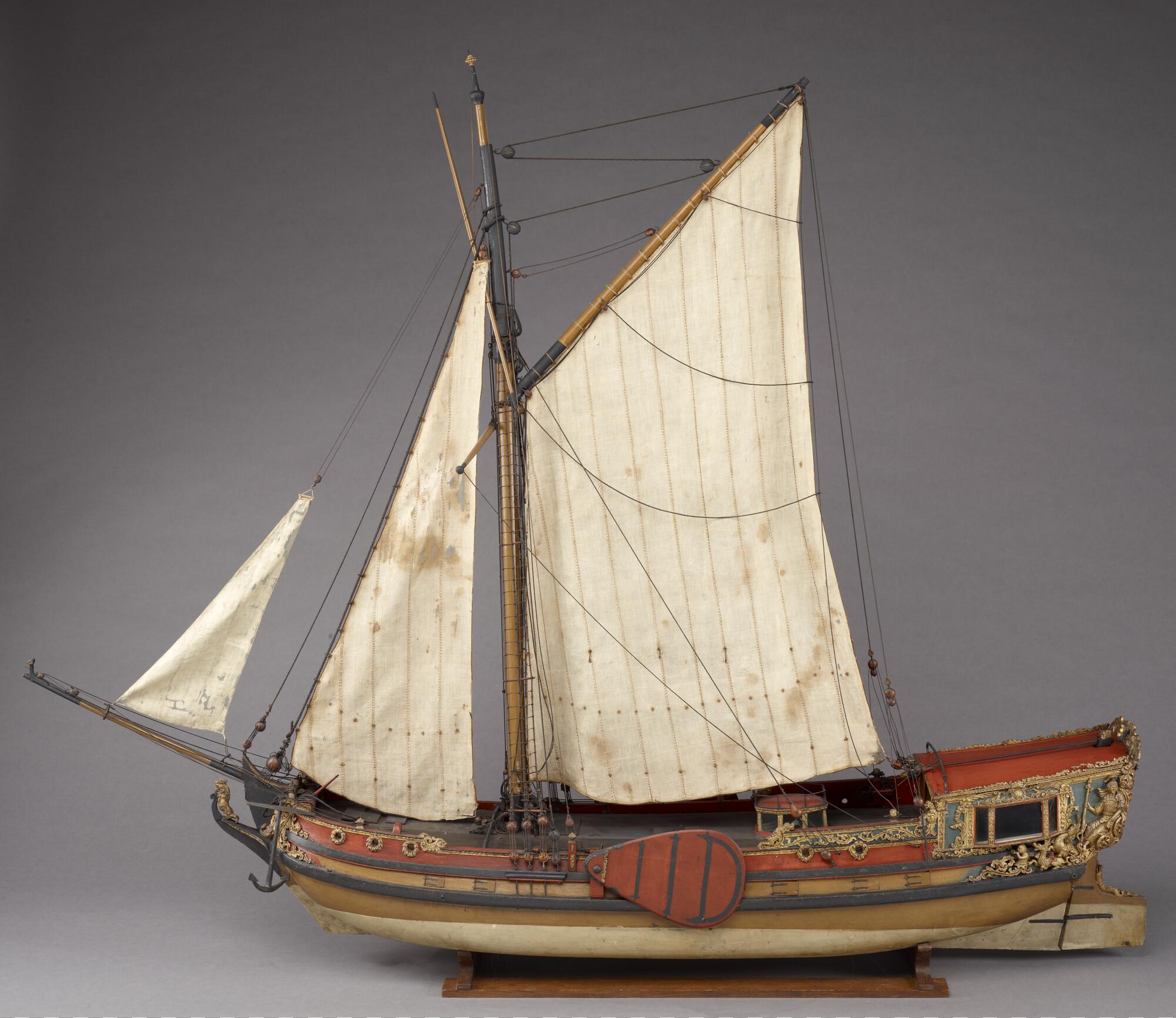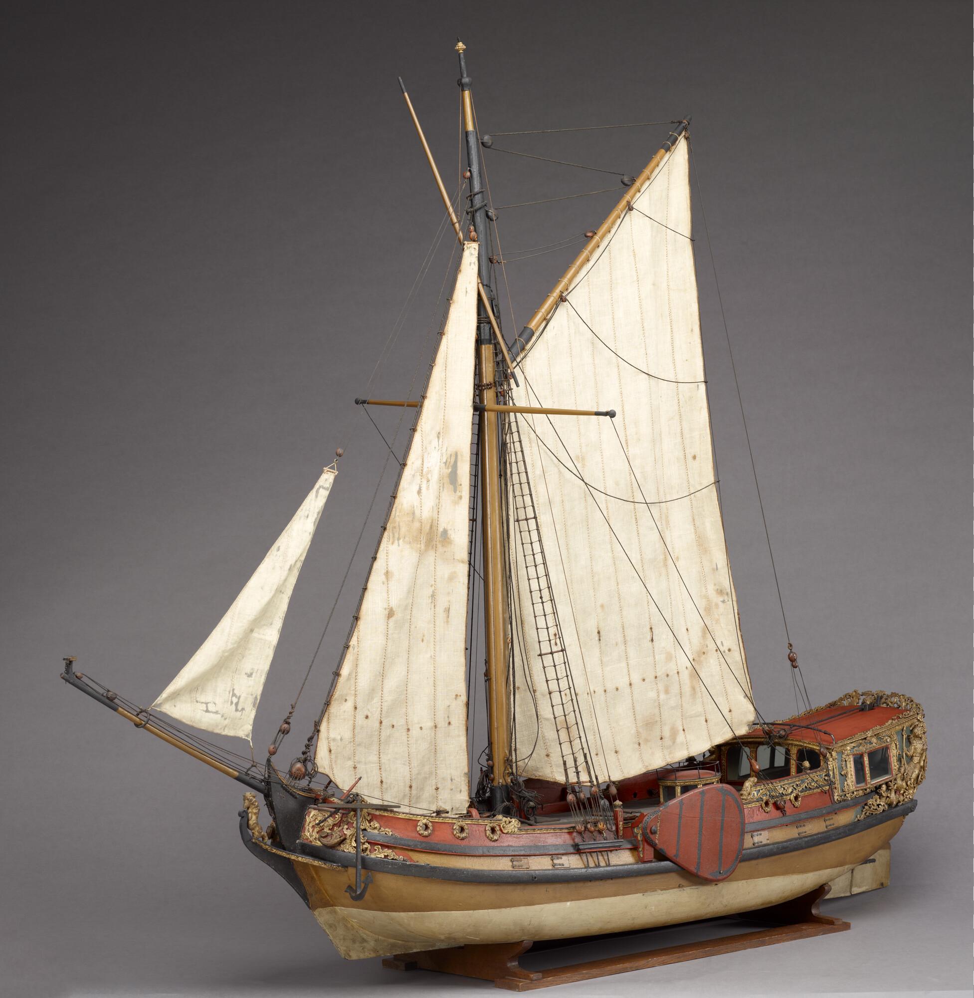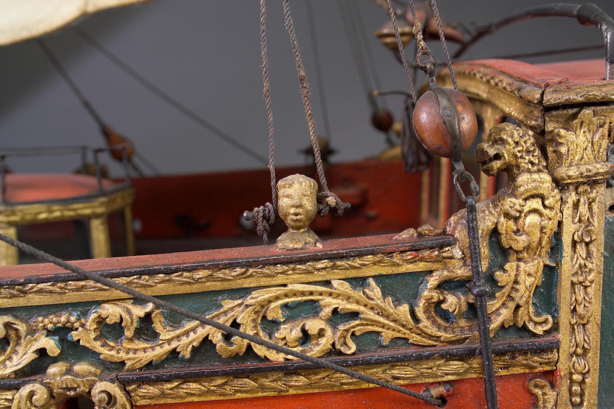 Getuigd model van het jacht voor Johann Wilhelm van de Palts. Op de spiegel het wapen van Johann Wilhelm met keurvorstelijke hoed en ook de tekenen van de St. Hubertusorde en de orde van het Gulden Vlies.