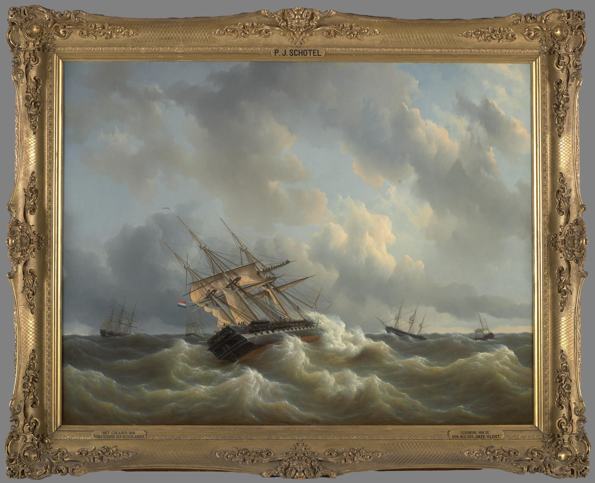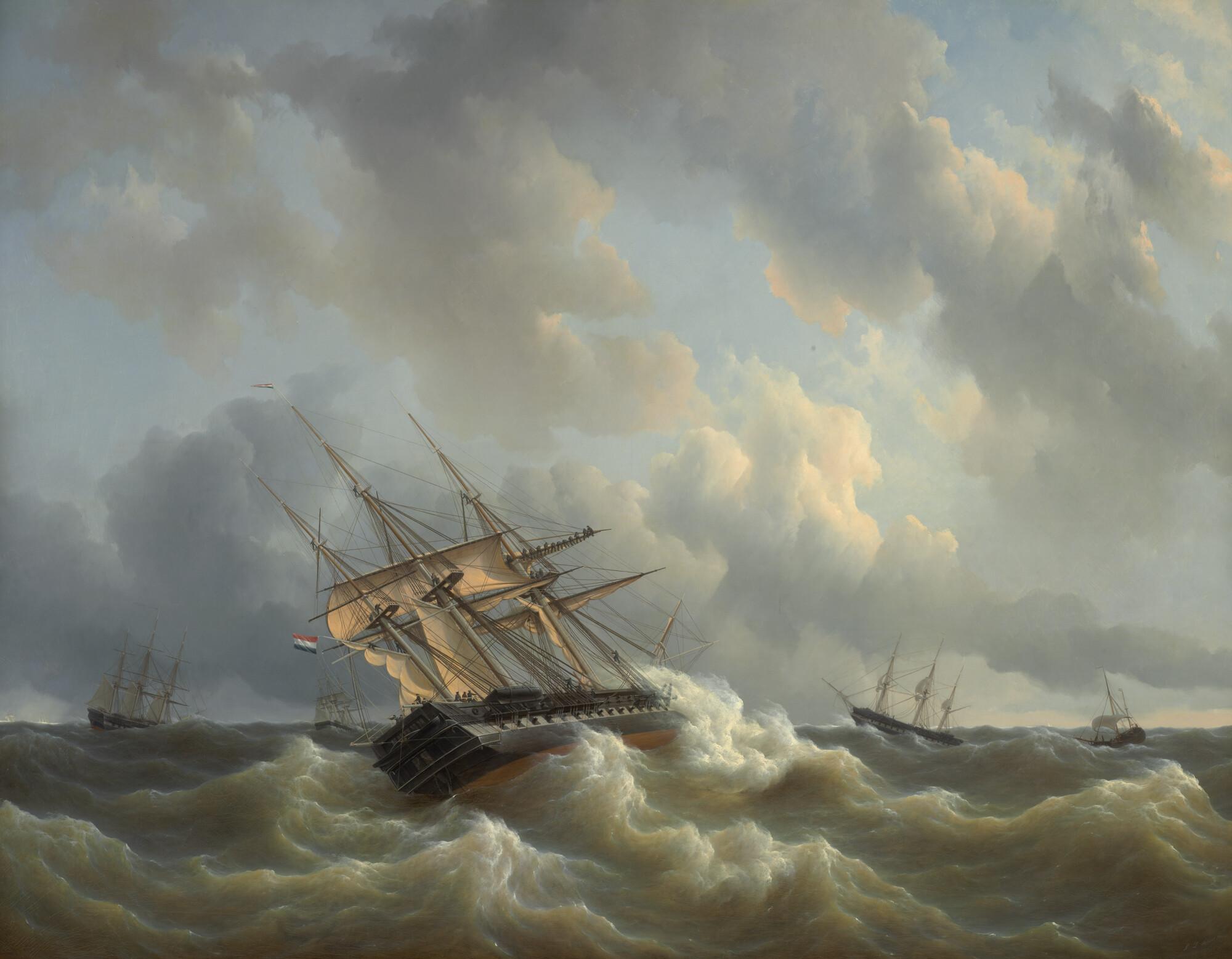 Het eskader van prins Hendrik met slecht weer in het Kanaal in oktober 1843.