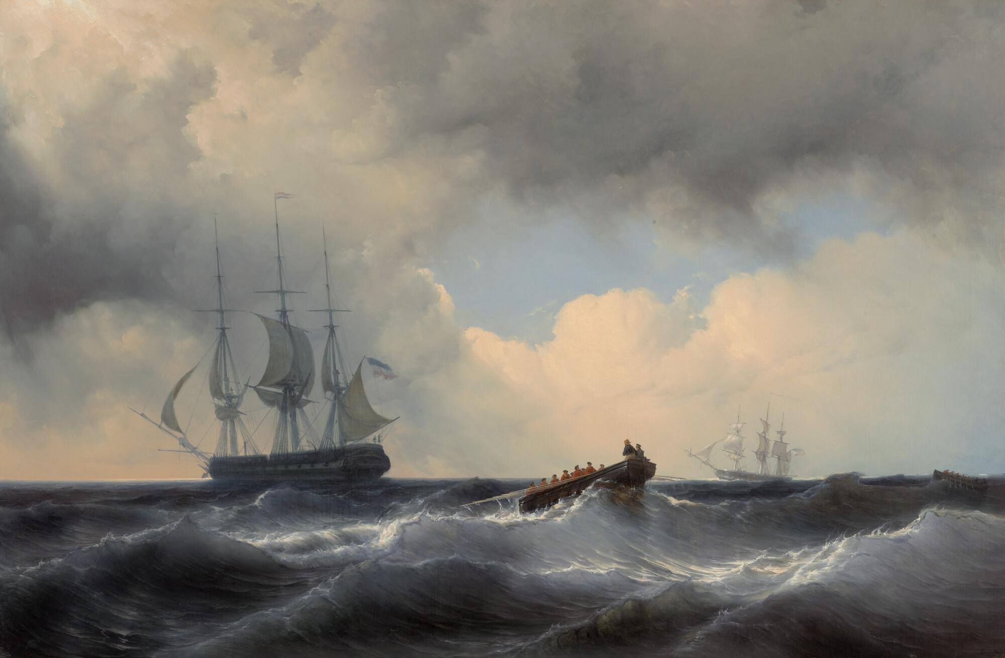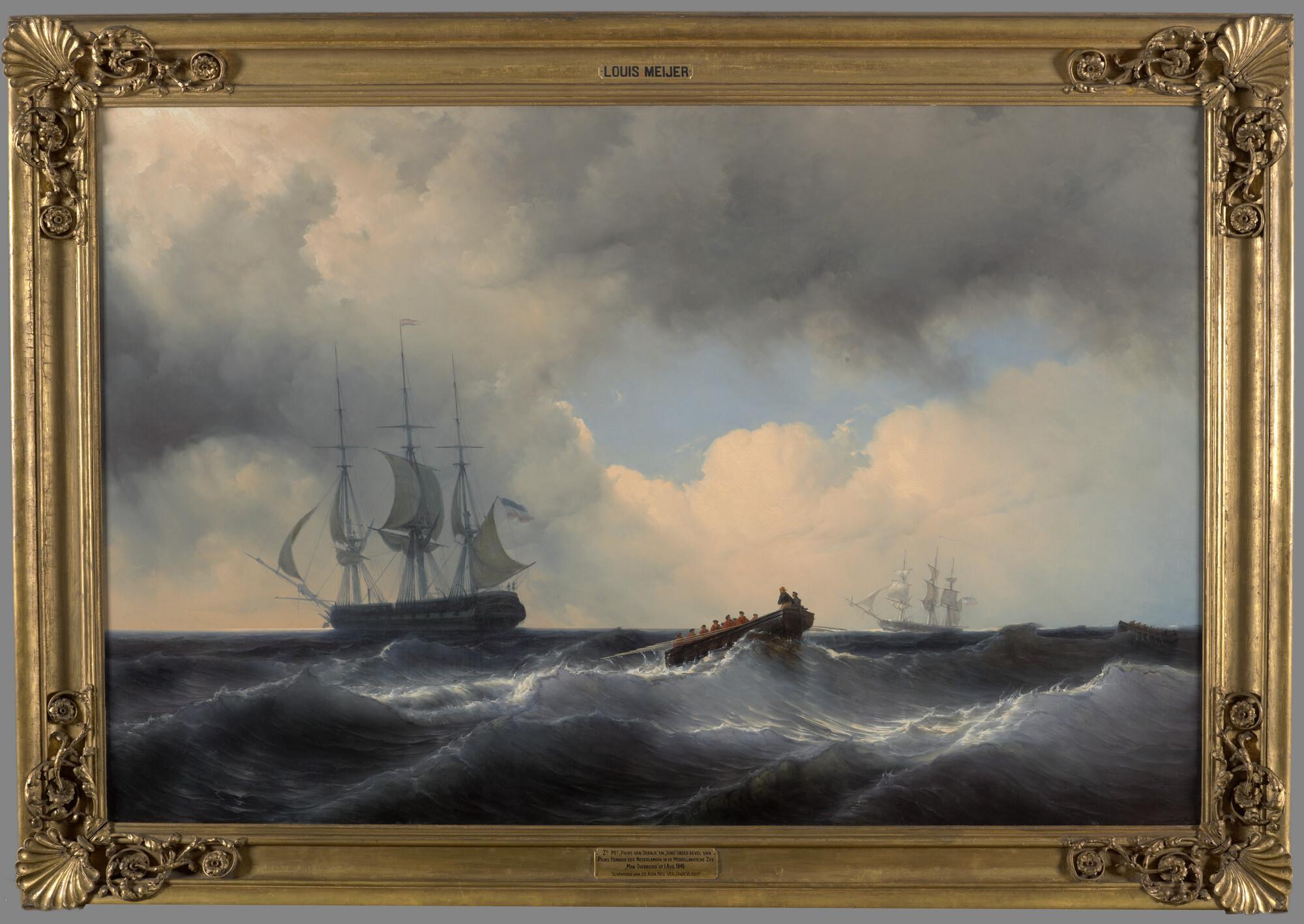 Zoeken naar een overboord geslagen schepeling tijdens een eskaderreis van Nederlandse oorlogsschepen naar de Middellandse Zee, augustus 1846. Het fregat Zr.Ms. Prins van Oranje en het korvet Zr.Ms. korvet Juno onder commando van prins Hendrik bijgedraaid liggend.