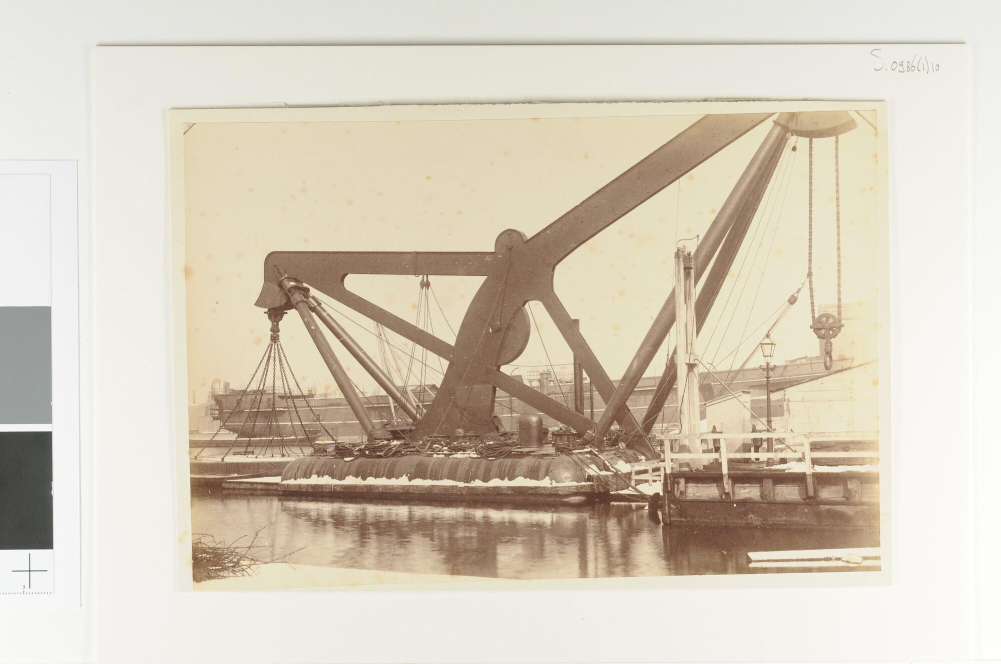 Een drijvende stoomkraan in de winter afgemeerd aan de Rijkswerf te Amsterdam. Op de achtergrond ligt de romp van het fregat Zr.Ms. "Tromp".