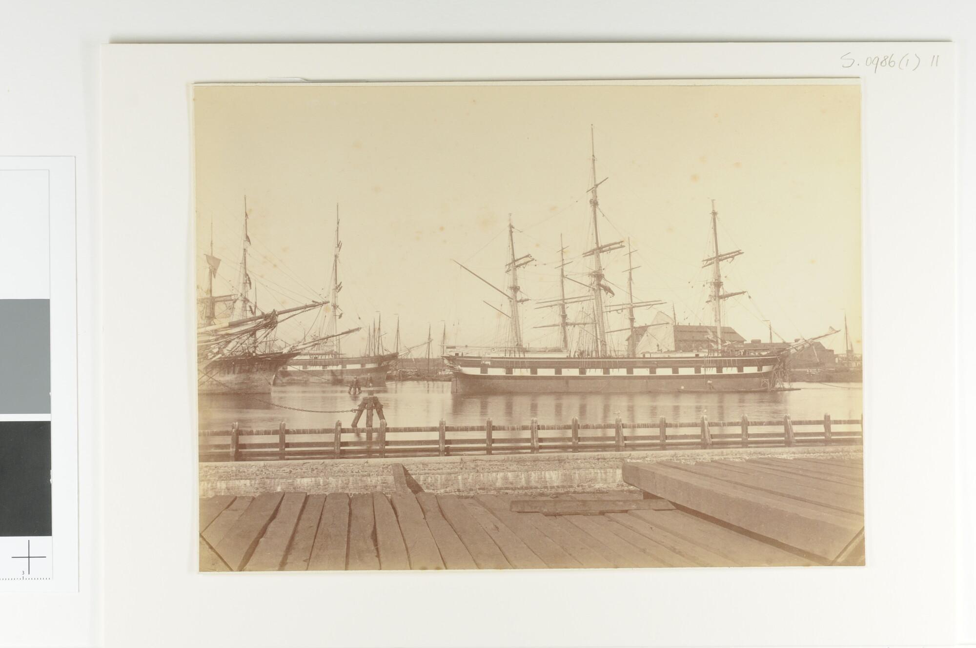 Gezicht op het Oosterdok en enkele afgemeerde zeilschepen december 1882