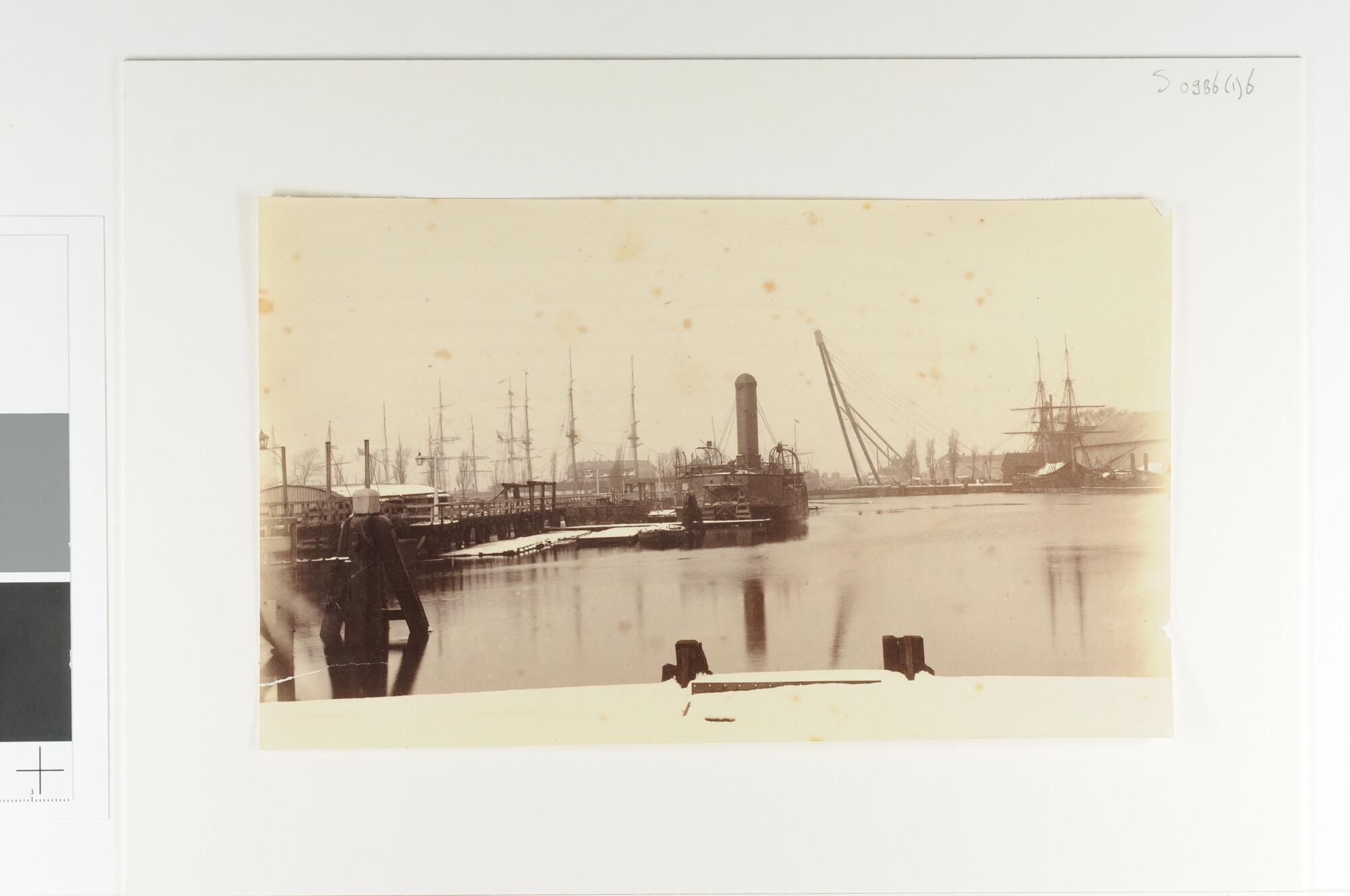 De Rijkswerf te Amsterdam in de winter met verschillende afgemeerde marineschepen.