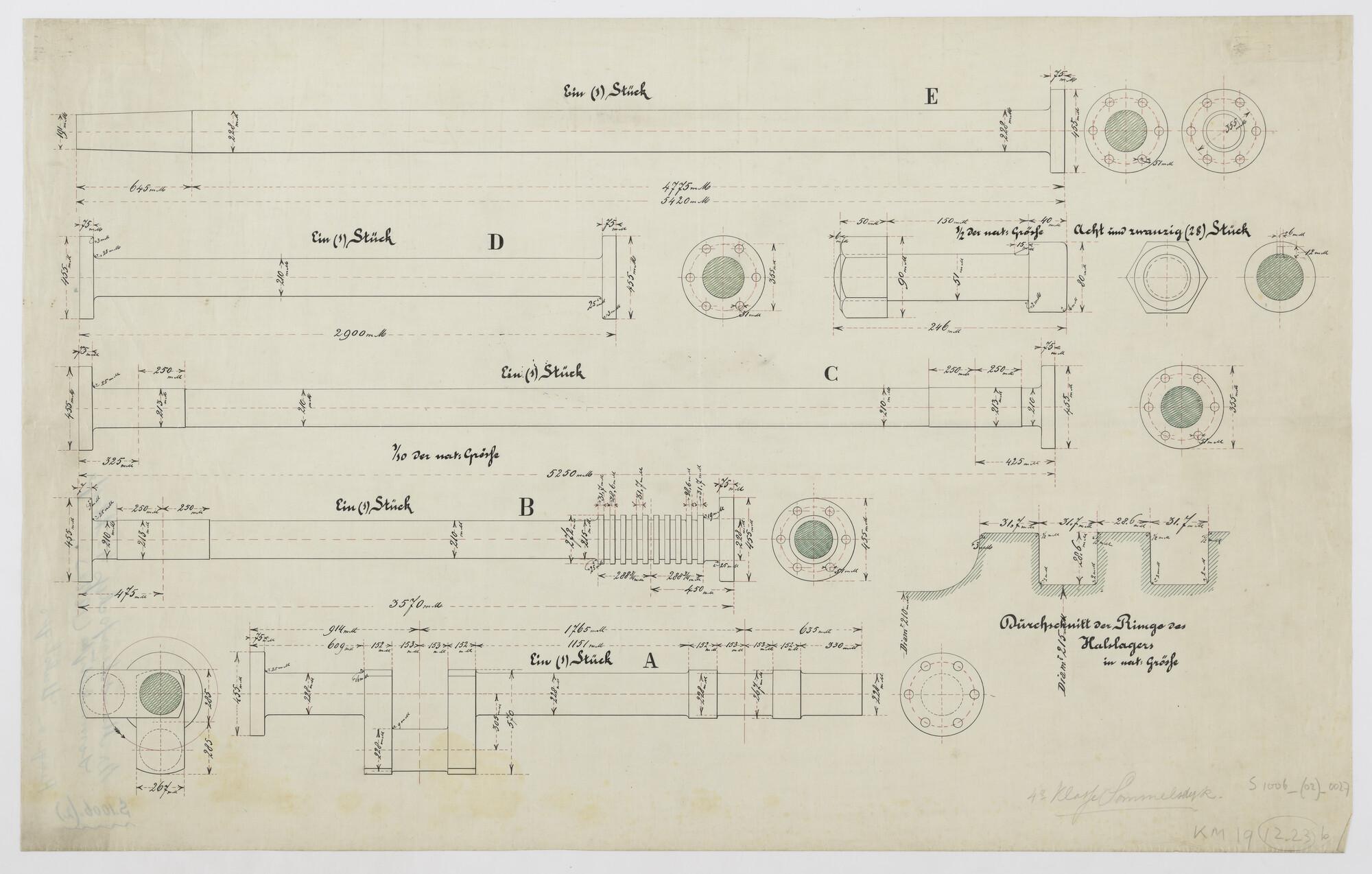 Diverse doorsneden van drijfstangen en assen van het schroefstoomschip Zr.Ms. Sommelsdijk
