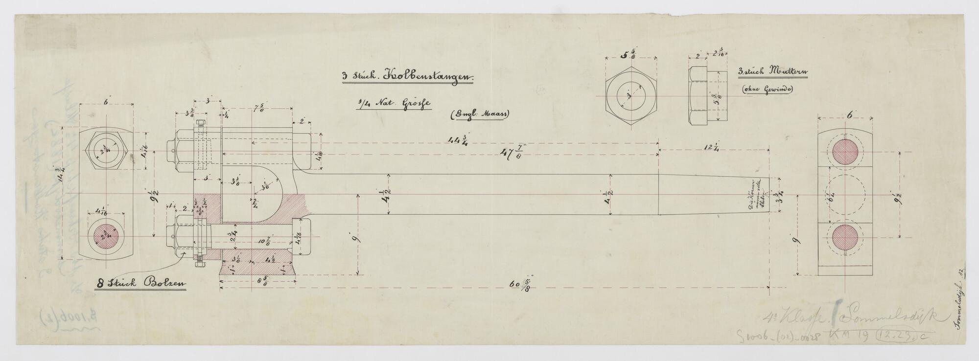 Diverse doorsneden van drijfstangen en assen van het schroefstoomschip der vierde klasse Zr.Ms. "Sommelsdijk" (vermoedelijk) (schaal in ware grootte).