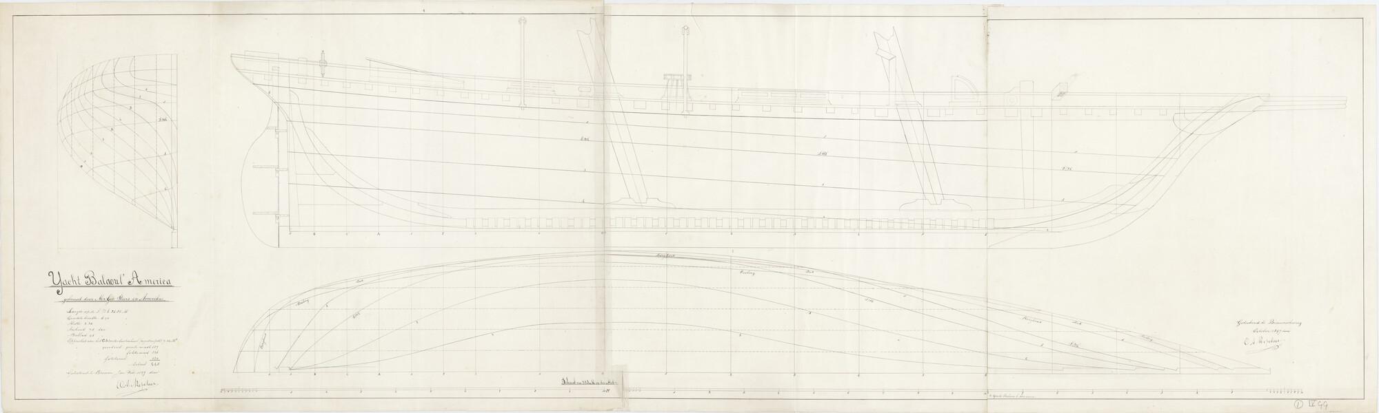 Verticale langsdoorsnede en lijnenplan van het jacht "Balout l'America", 1897.
