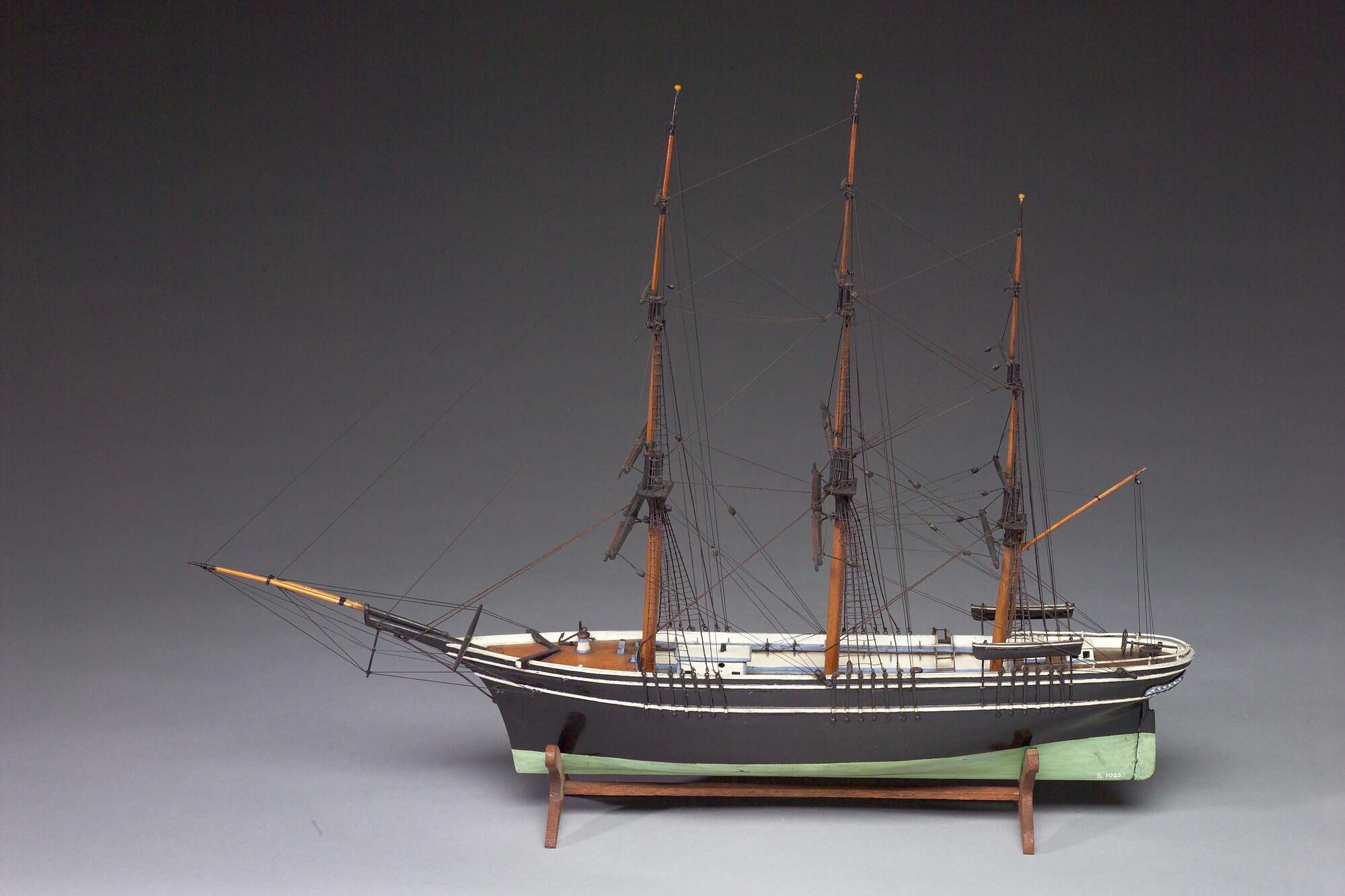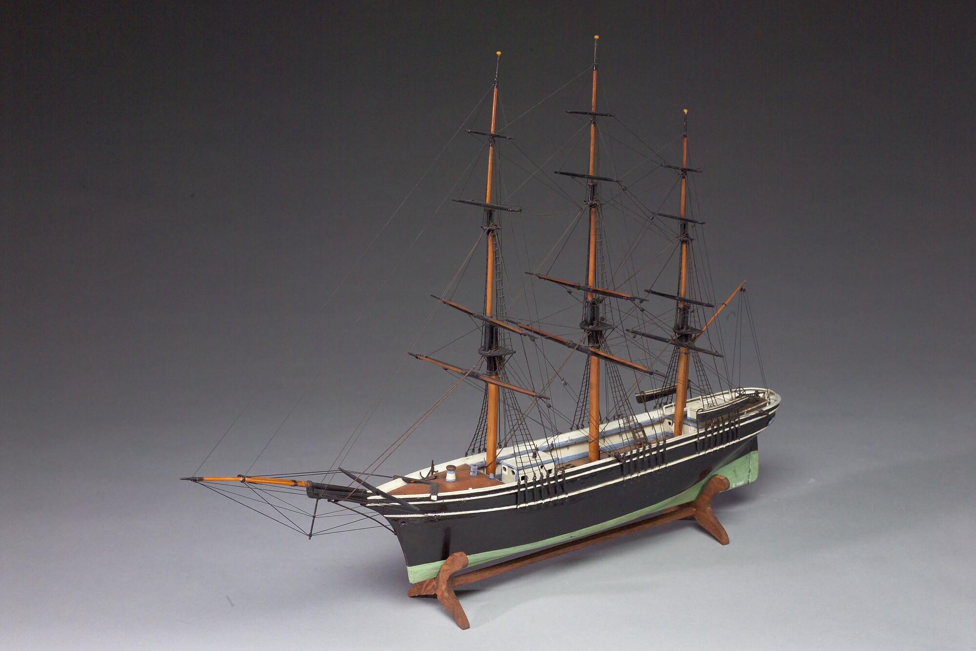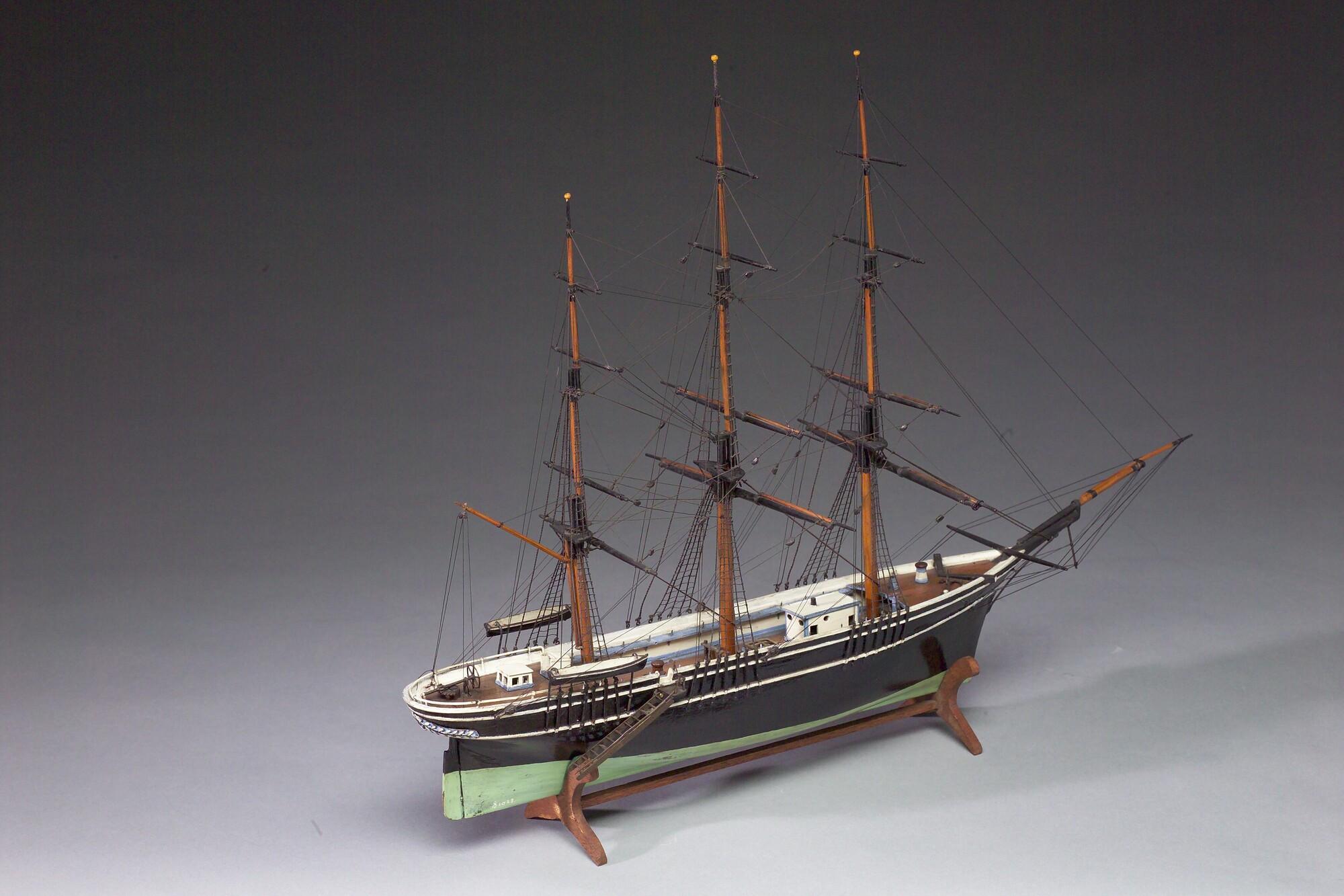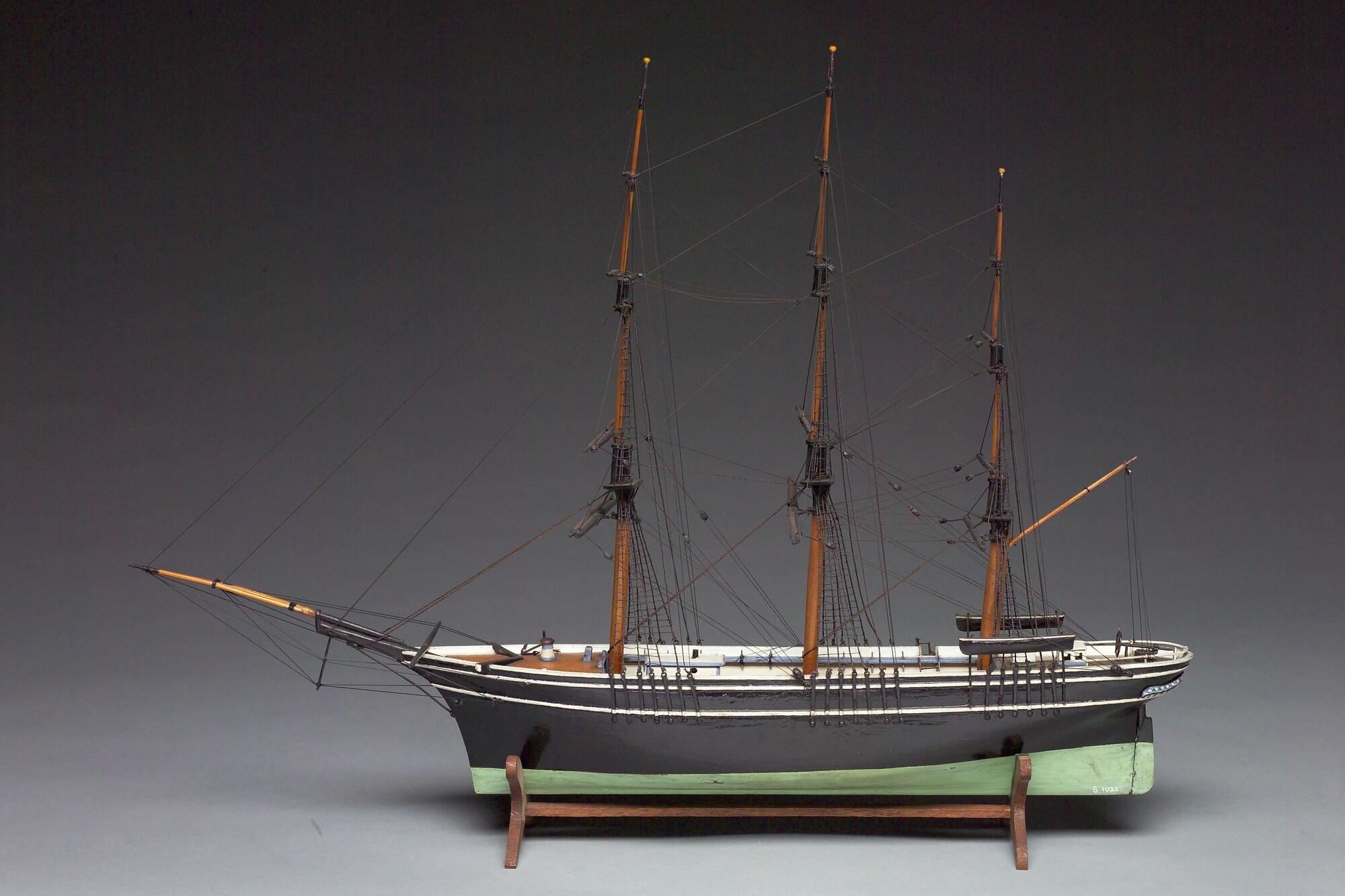 Getuigd model zonder zeilen van een bark, midden negentiende eeuw.