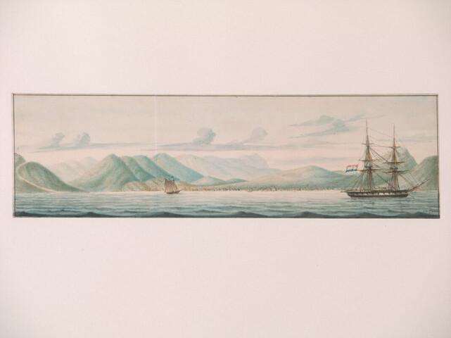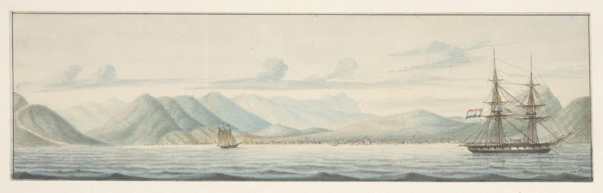 Philipsburg op het eiland Sint Maarten, links een Nederlandse schoener, rechts een Nederlandse oorlogsbrik.