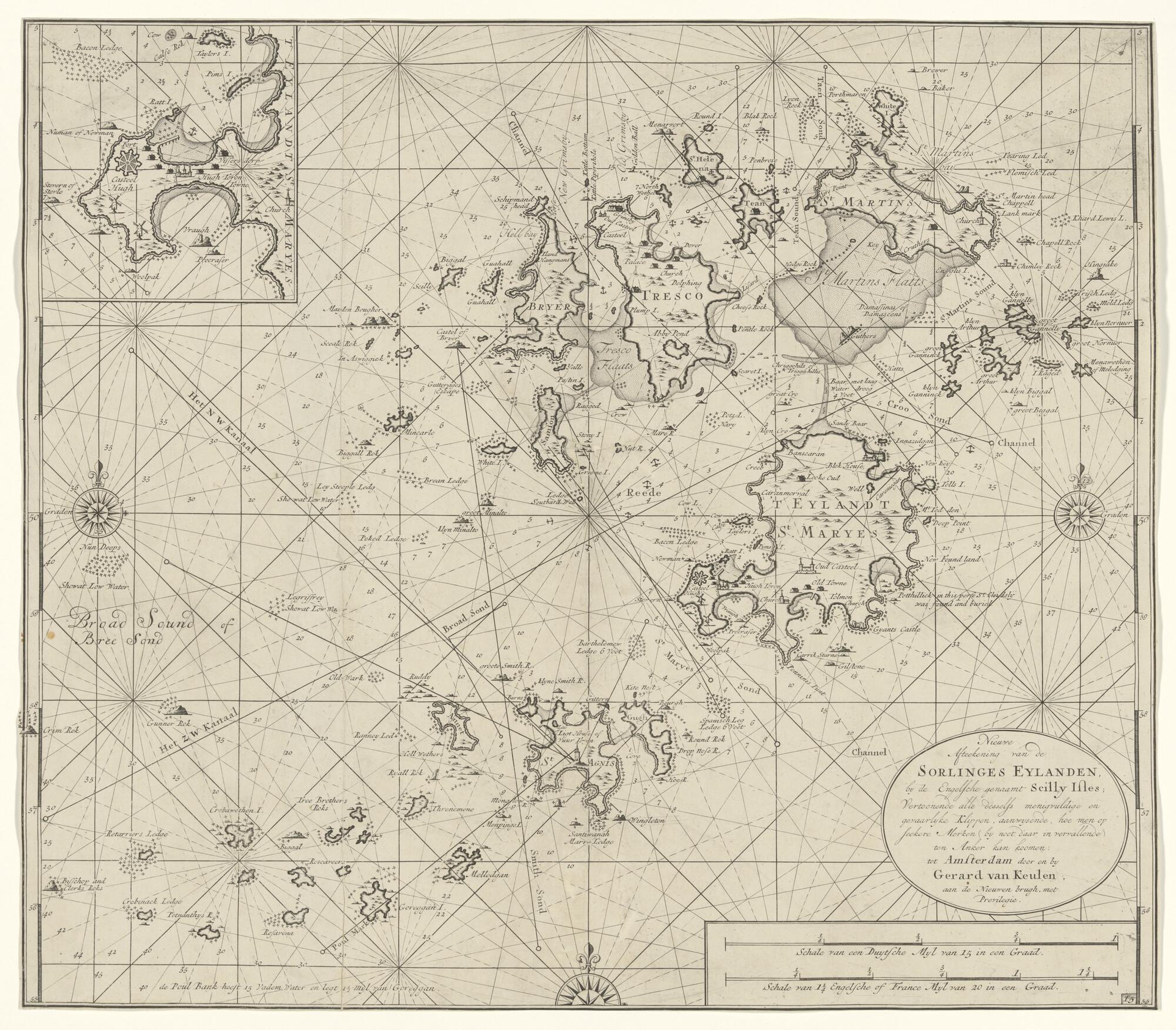 Landverkenningen van de zuidkust van Engeland tussen Dover en Dartmouth. Uitgave Johannes van Keulen, Amsterdam, circa 1700.