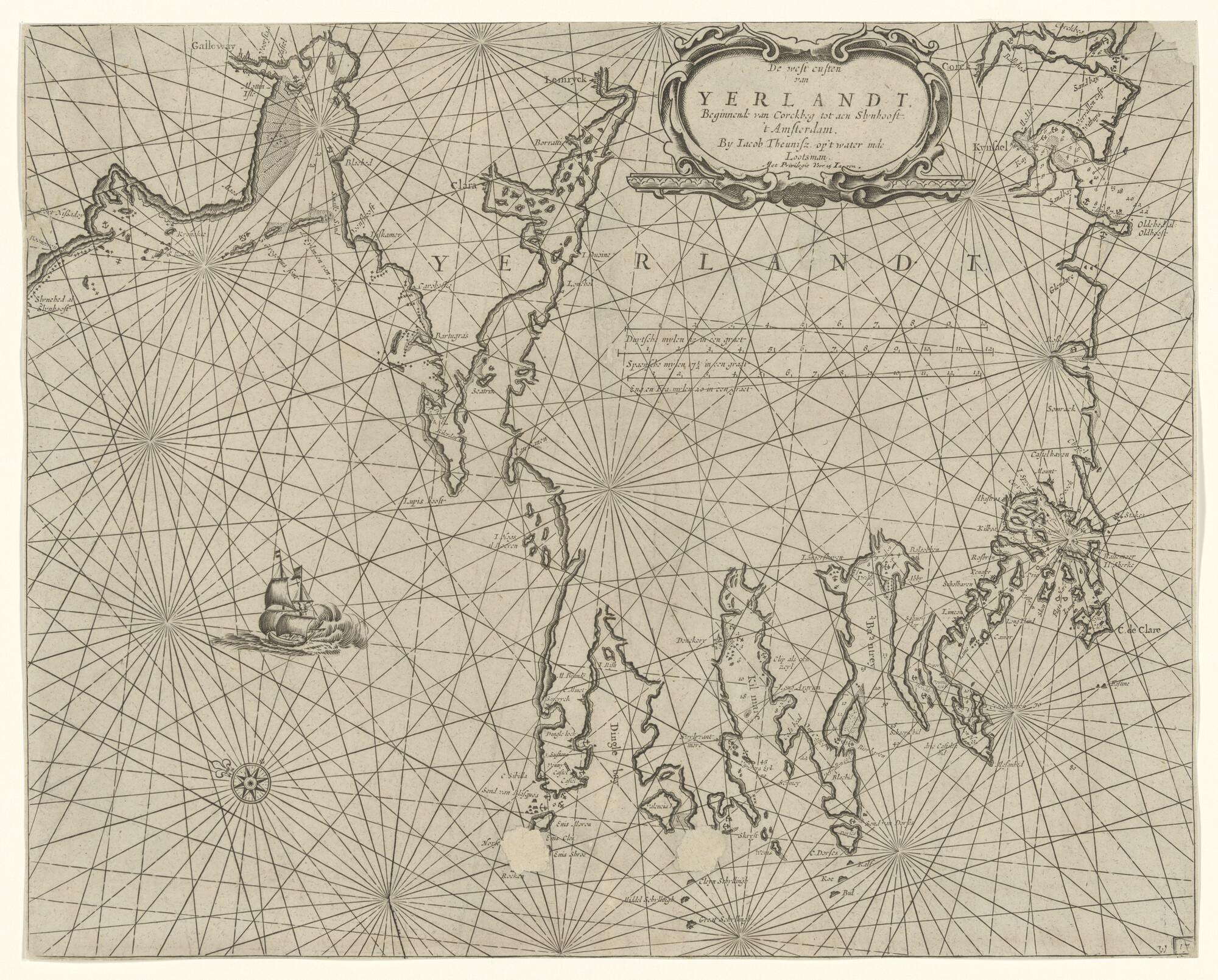 Zeekaart van de westkust van Ierland tussen het eiland Corckbeg en Slynhooft. Door Anthonie Jacobsz (circa 1606 - 1650), Amsterdam, 1643 (schaal 1 op 450.000).
