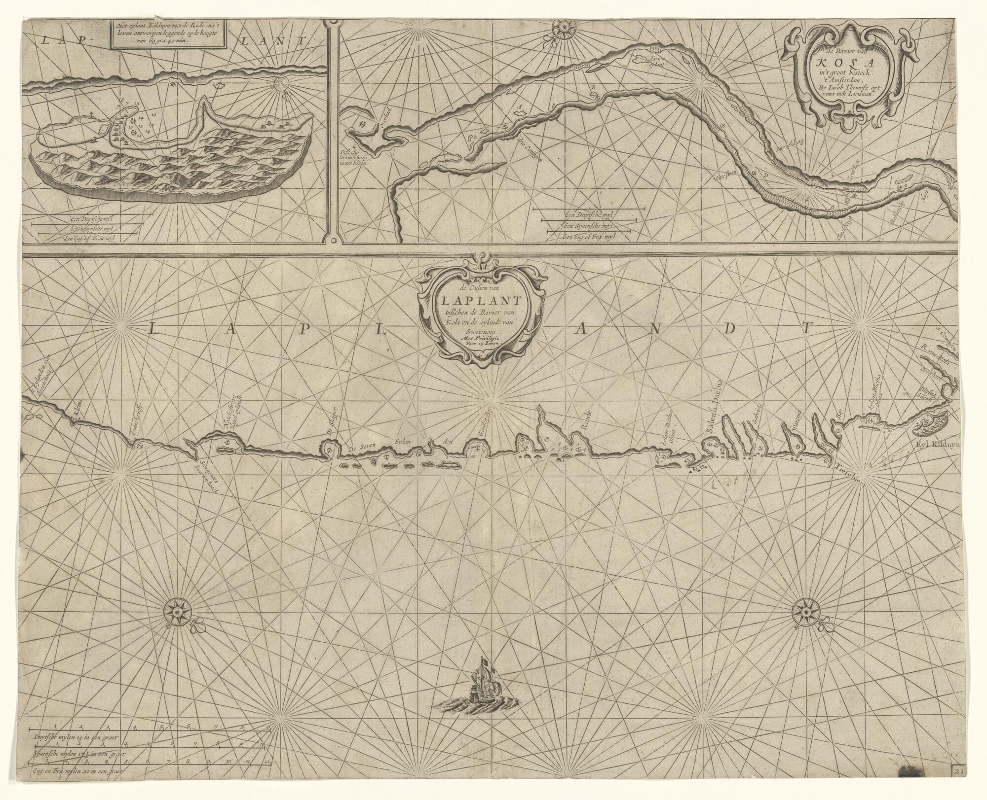 Zeekaart van de kust van Lapland tussen de Kola Rivier en het eiland Swetenoes, met een detailkaart van het eiland Kildyn en de rede, door Anthonie Jacobsz (circa 1606 - 1650), Amsterdam, 1643 (schaal 1 op 100.000).