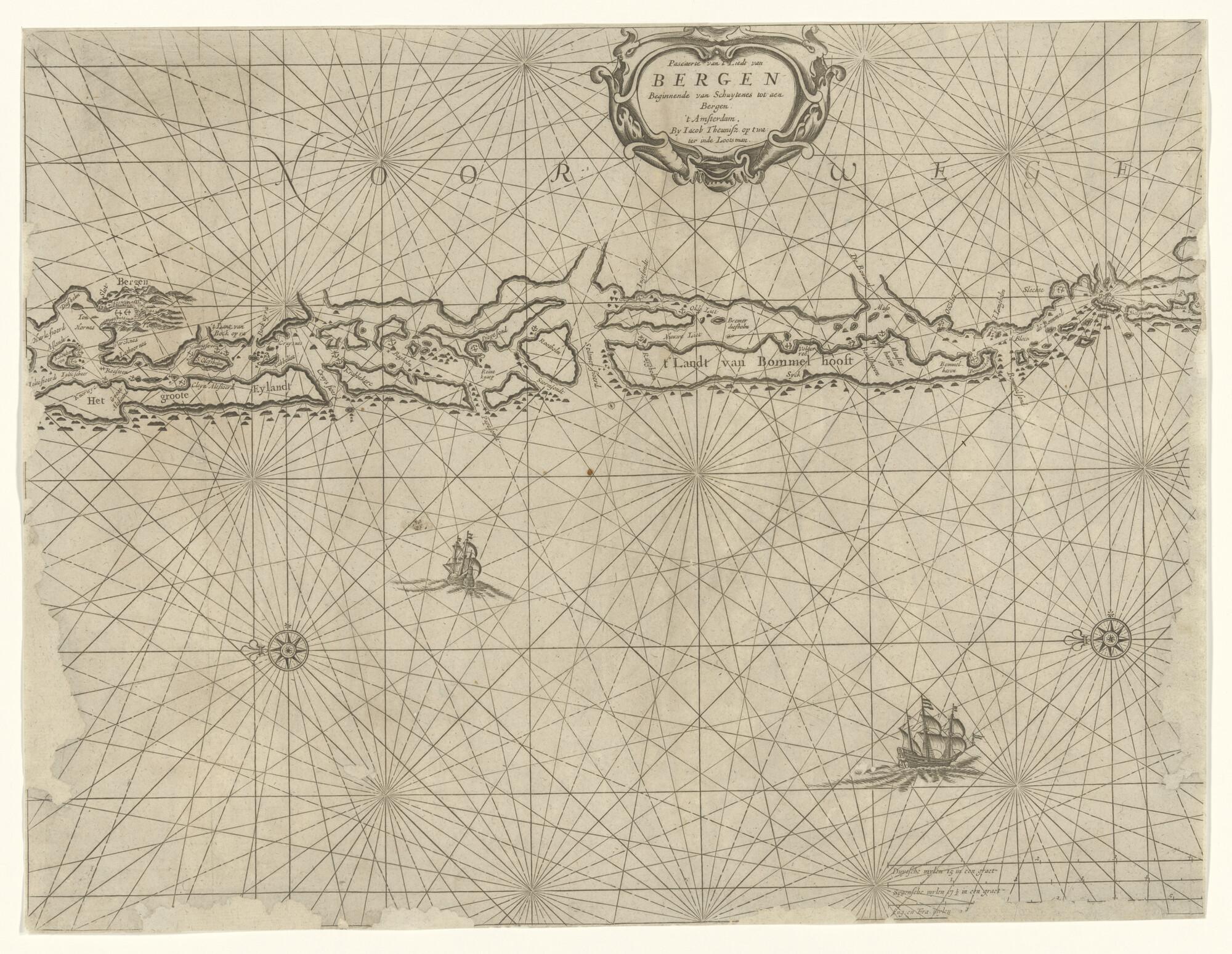 Zeekaart van 't Liedt van Bergen, van Schuytenes tot Bergen in Noorwegen. Door Anthonie Jacobsz (circa 1606 - 1650), Amsterdam, 1643 (schaal 1 op 250.000).