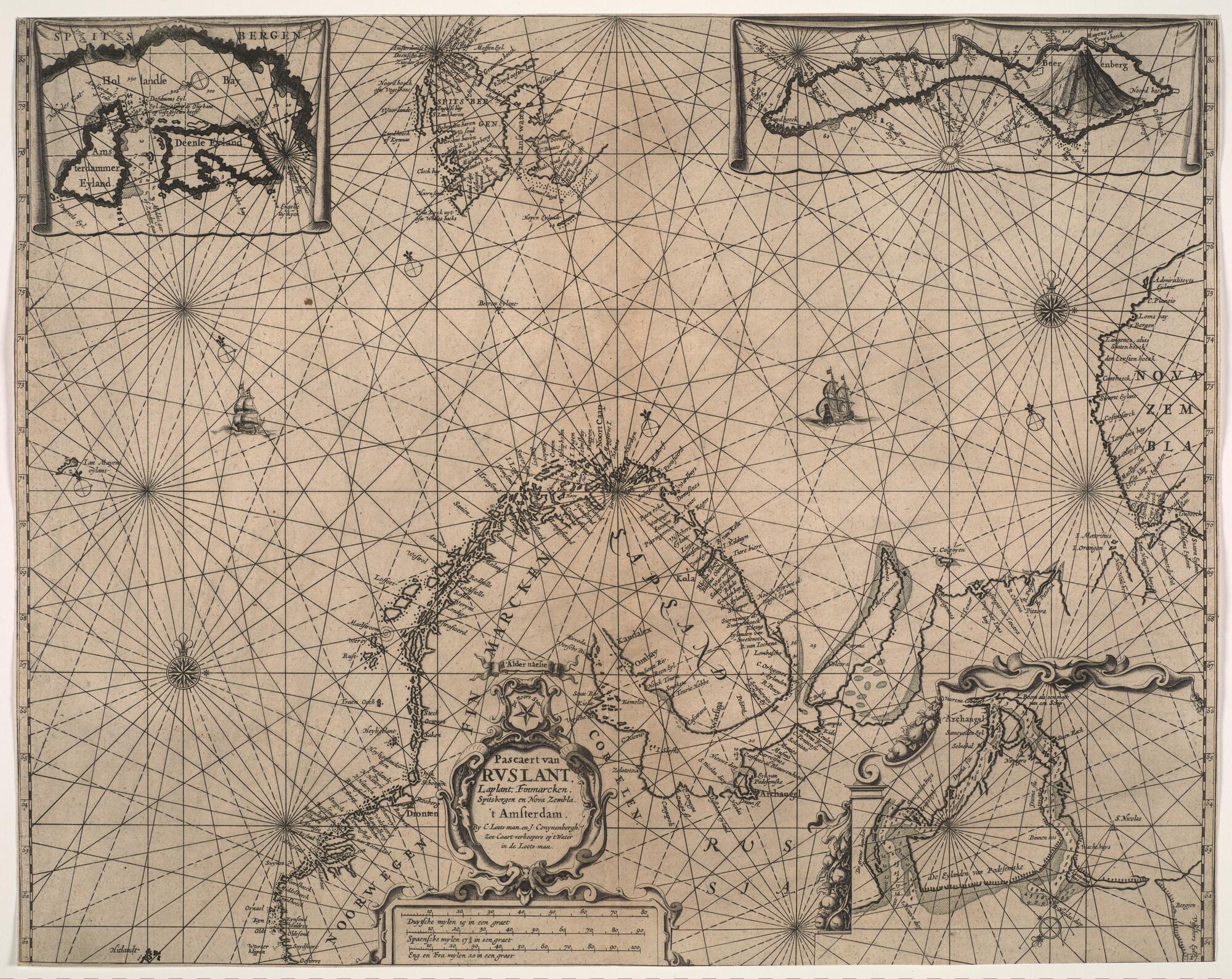 Zeekaart van Noord-Atlantische Oceaan en Barentszee, door Caspar Lootsman en Jacob Conynenberg, Amsterdam, 1705. Met detailkaarten van Amsterdam en Deense eiland, Jan Mayen en Archangel. De kaart is afkomstig uit: 'T Eerste Deel, van de Nieuwe Groote Loots-Mans Zee-Spiegel ... ' Amsterdam, Casparus Loots-man, 1705 (schaal 1 op 5.500.000).
