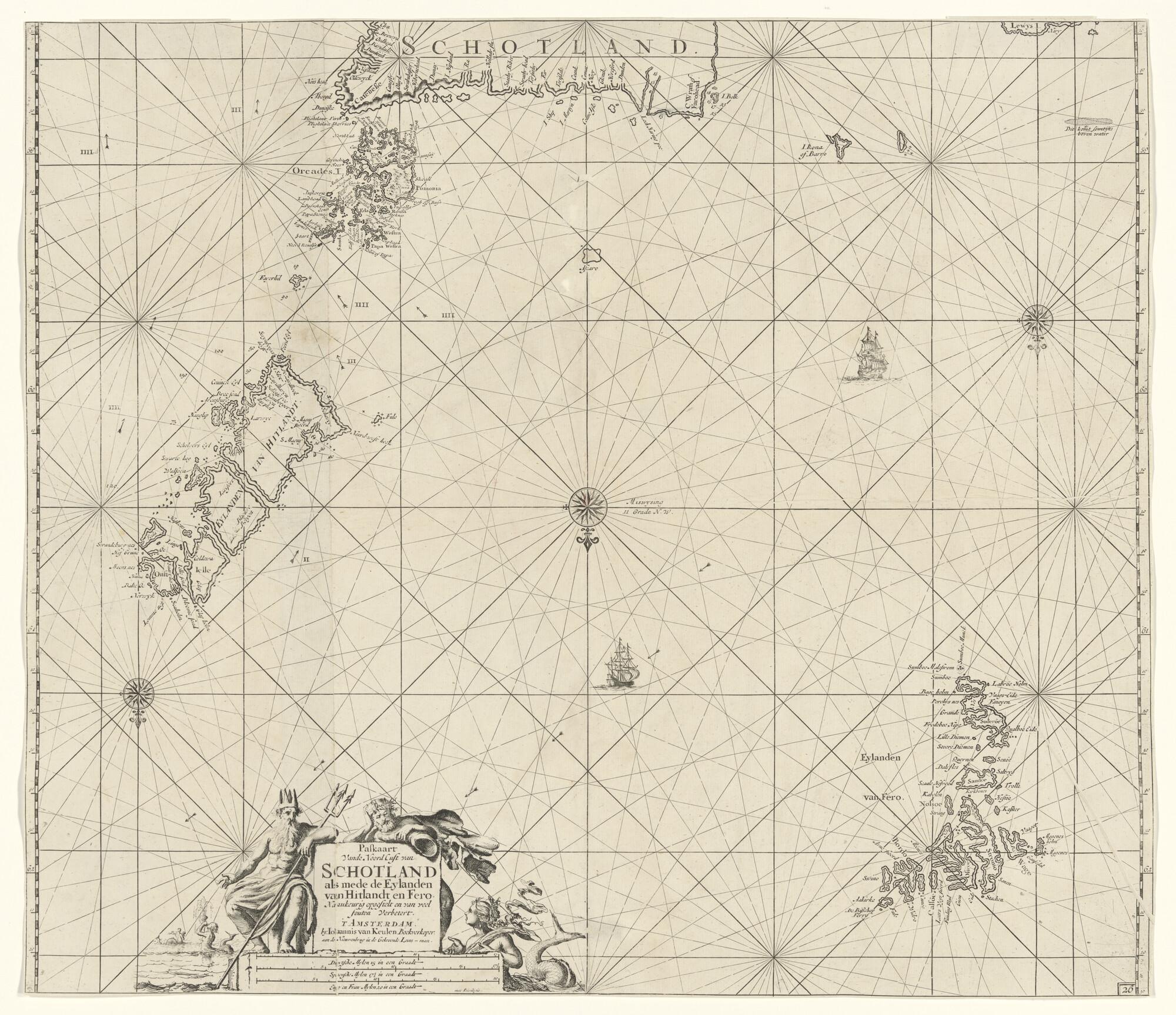 Zeekaart van de wateren rond de noordkust van Schotland, de Orkney, Shetland en Far Oer eilanden. Uitgave door Johannes van Keulen (1654 - 1715) te Amsterdam, 1682 (schaal 1 op 900.000).