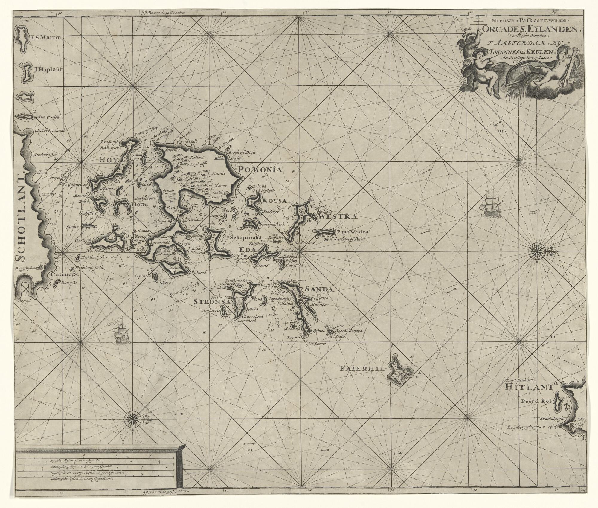 Paskaart van de Orkney eilanden, door Claas Jansz. Vooght (+ 1696). Uitgave Johannes van Keulen (1654 - 1715) Amsterdam, 1695 (schaal 1 op 200.000).