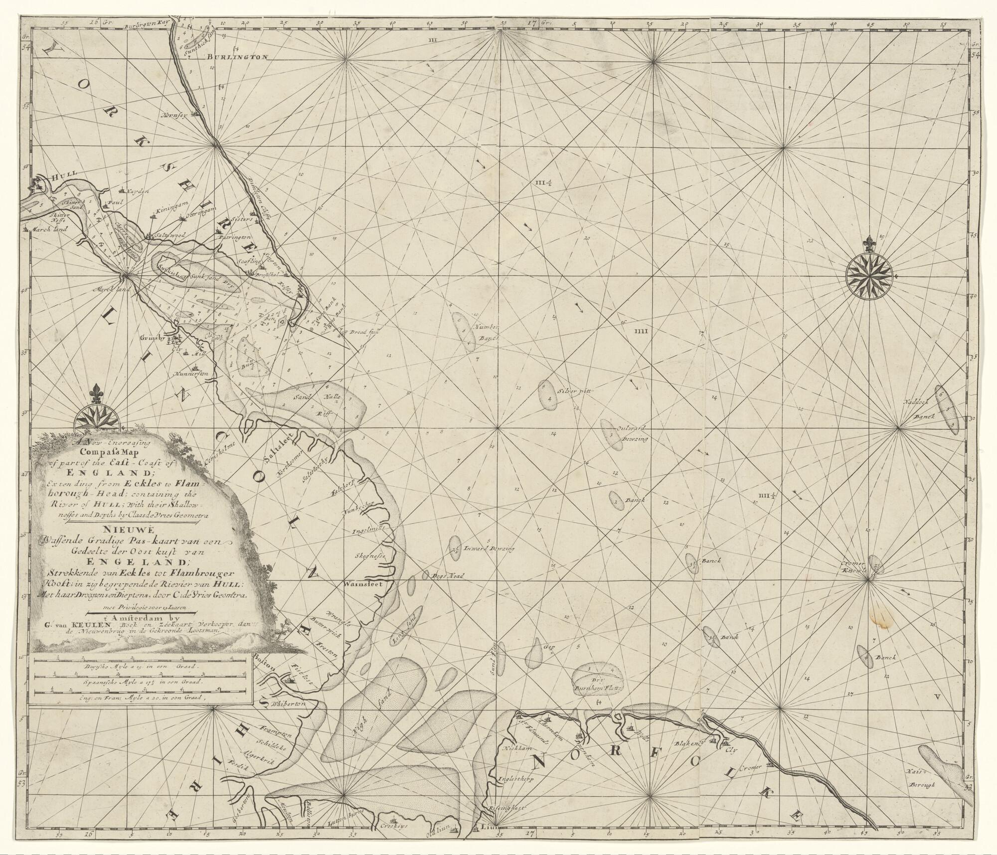 Zeekaart van een deel van de oostkust van Engeland, tussen Eckles en Flamborough Head, met de Humber, door Claes de Vries. Uitgave Gerard van Keulen, Amsterdam, 1709. Titel in Engels en Nederlands. Mercator projectie (schaal 1 op 250.000).