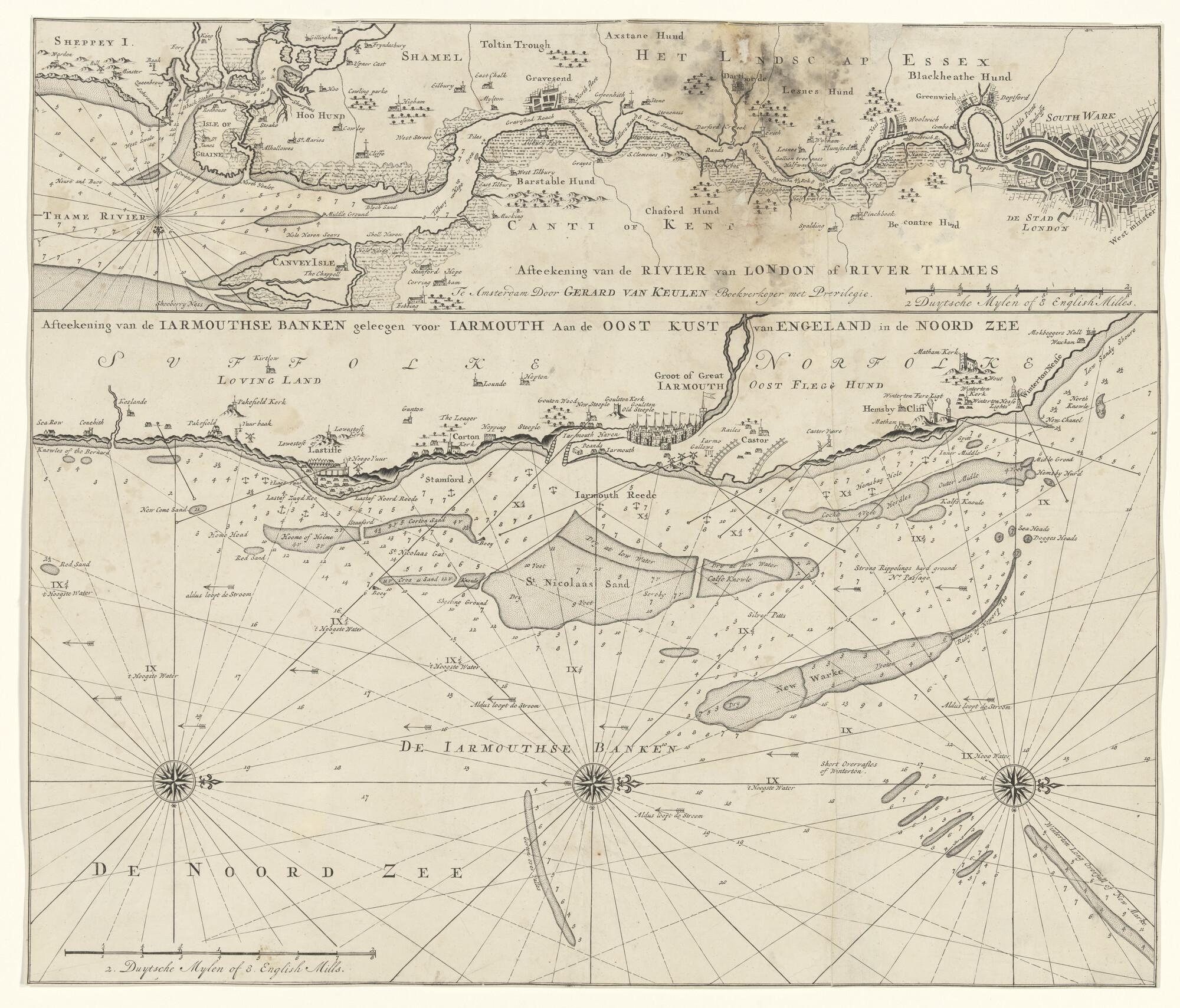 Twee kaarten op een blad van de rivier Thames en de banken van Yarmouth, door Gerard van Keulen (1678 - 1727), Amsterdam, 1734.