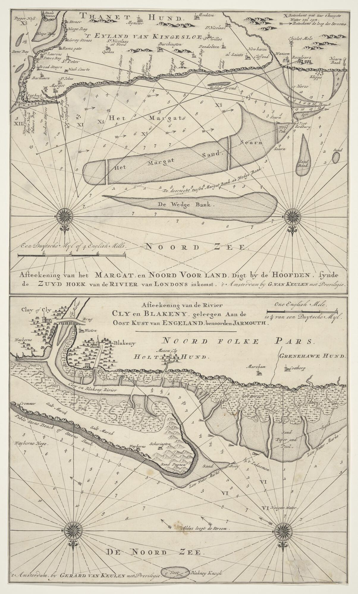 Kaarten van een deel van de oostkust van Engeland, de redes van Margate & Blakeny. Uitgave Gerard van Keulen (1678 - 1727), Amsterdam, 1734.