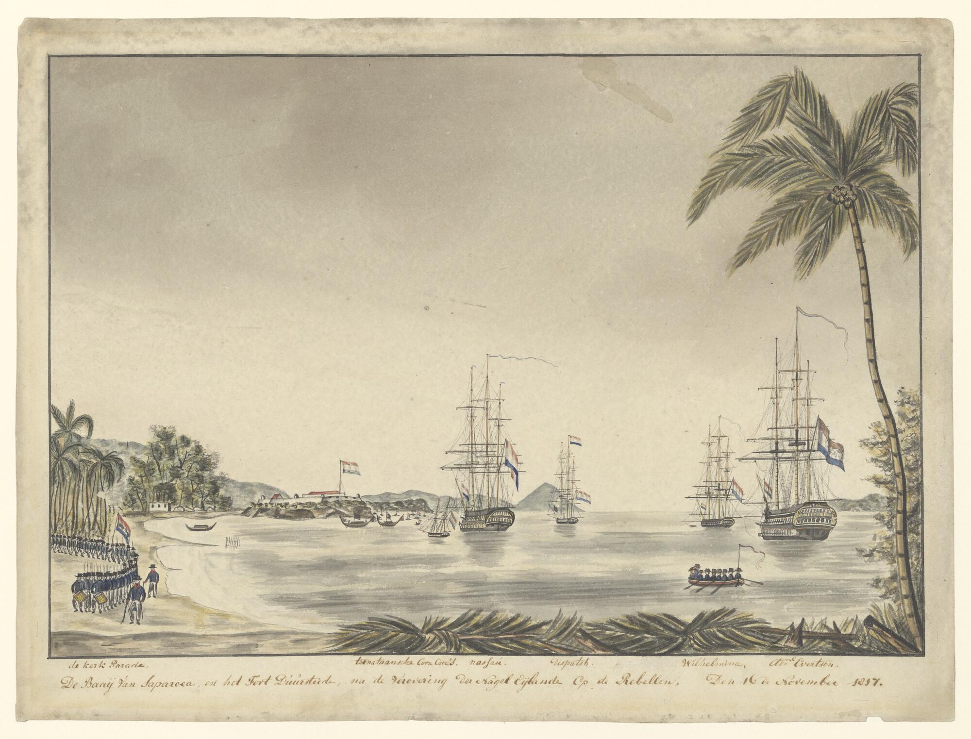 Het linieschip Zr.Ms. "Evertsen" en "Nassau" en fregat Zr.Ms. "Wilhelmina" in de baai van Saparoea na de verovering van Fort Duurstede; geheel links een compagnie Nederlandse soldaten, op de achtergrond Fort Duurstede