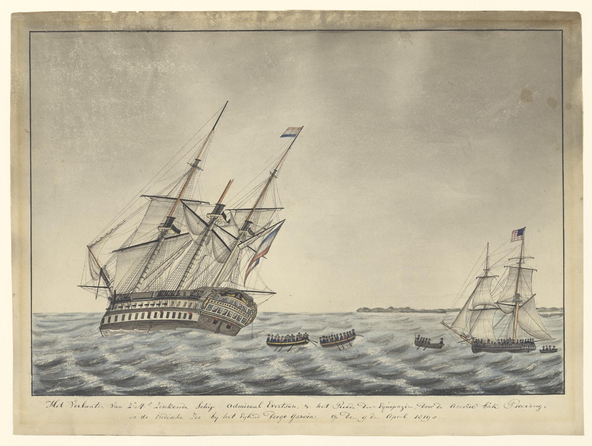 De redding van de bemanning van linieschip Zr.Ms. "Admiraal Evertsen" door het Amerikaanse brikschip "Pickering" nabij het eiland Diego Garcia, 1819. De romp van de "Evertsen" is met zeildoek gerepareerd.