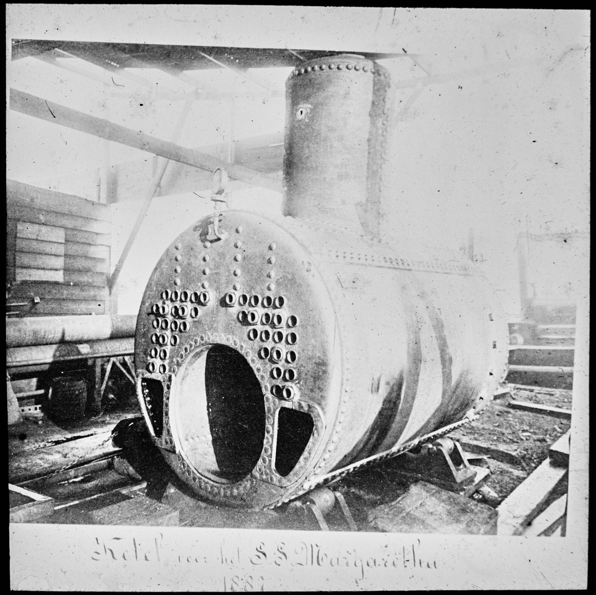 De stoomketel (nummer 27) gebouwd voor het stoombootje Margaretha, Amsterdam, 1887. [Lantaarnplaatje]