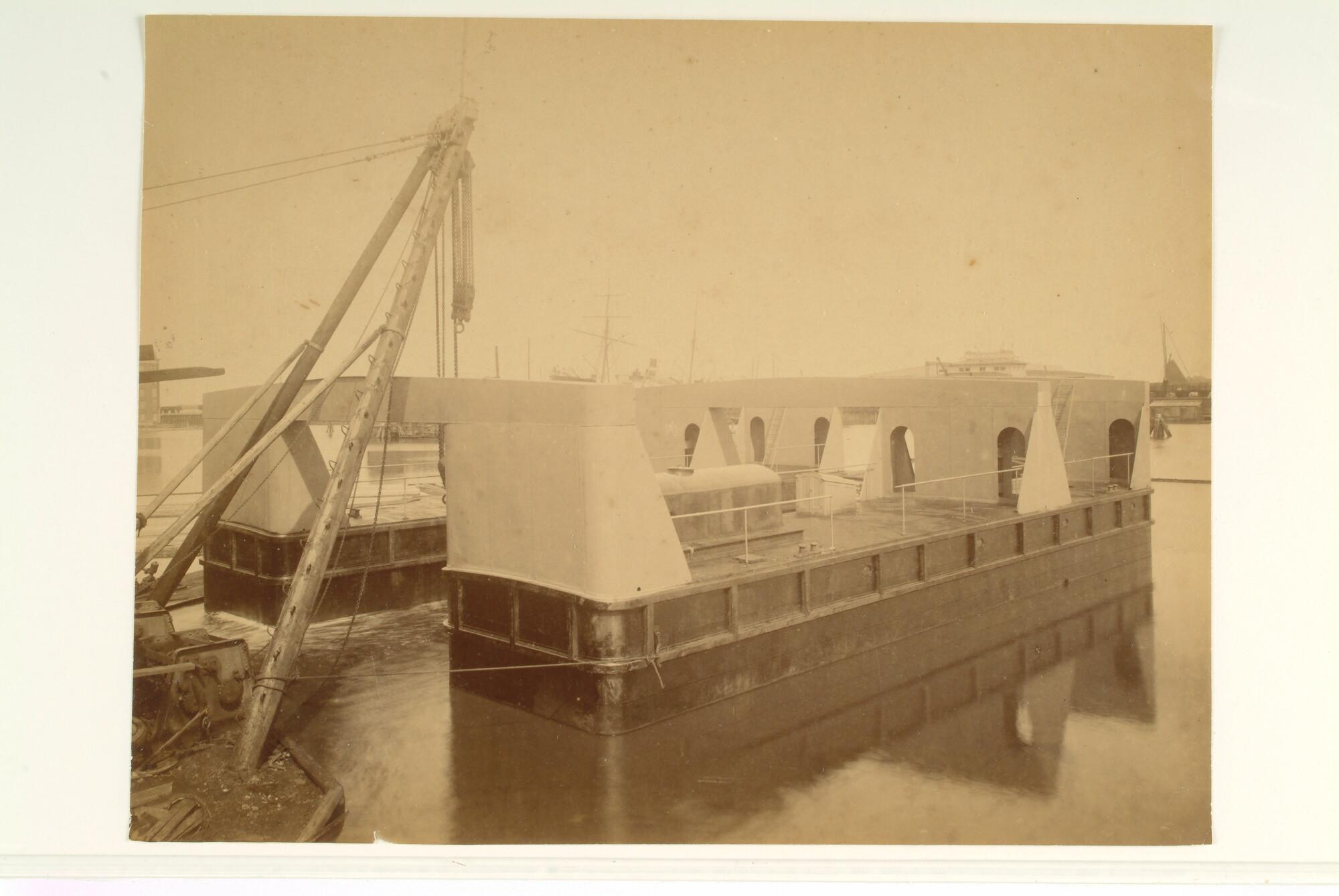 Graanoverslag in haven Amsterdam. Elevator voor vaartuigen, juni 1889 (voor- en zijaanzicht).
